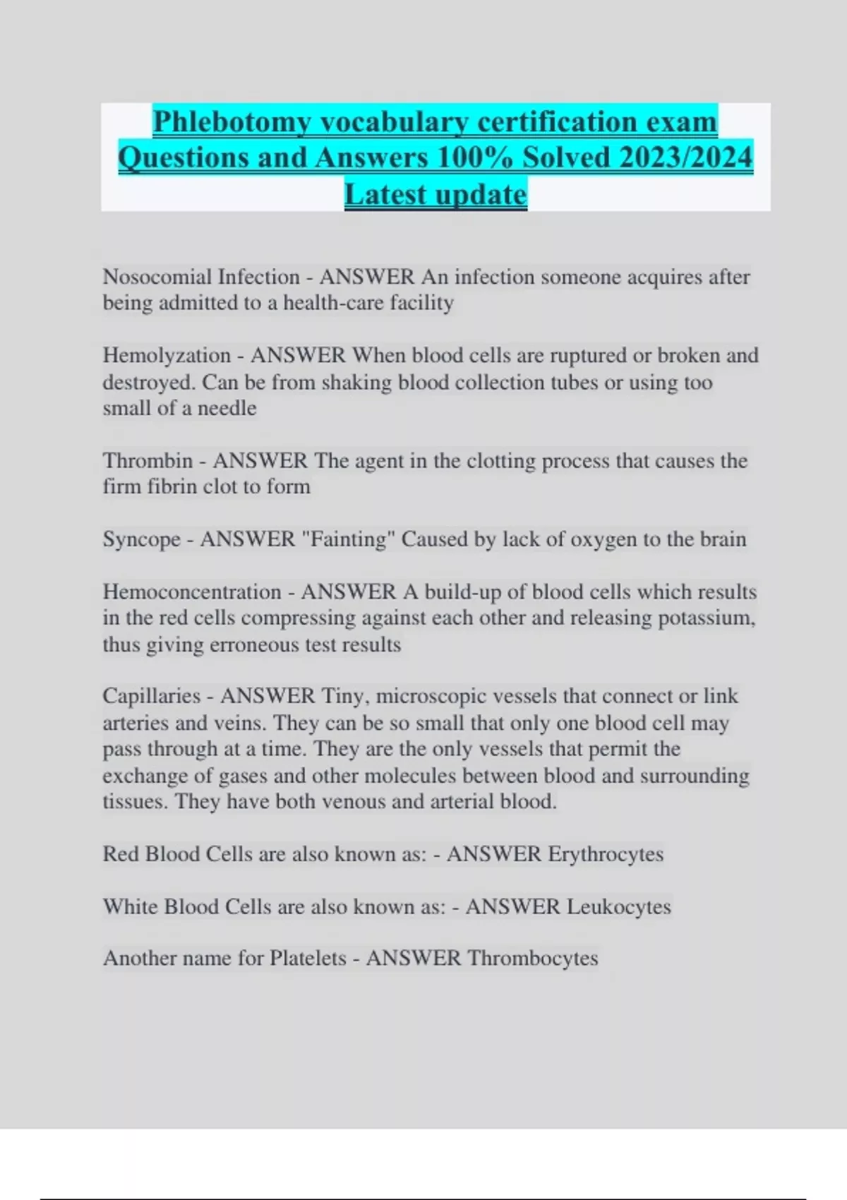 Phlebotomy vocabulary certification exam Questions and Answers 100% Solved 2023/2024 Latest update