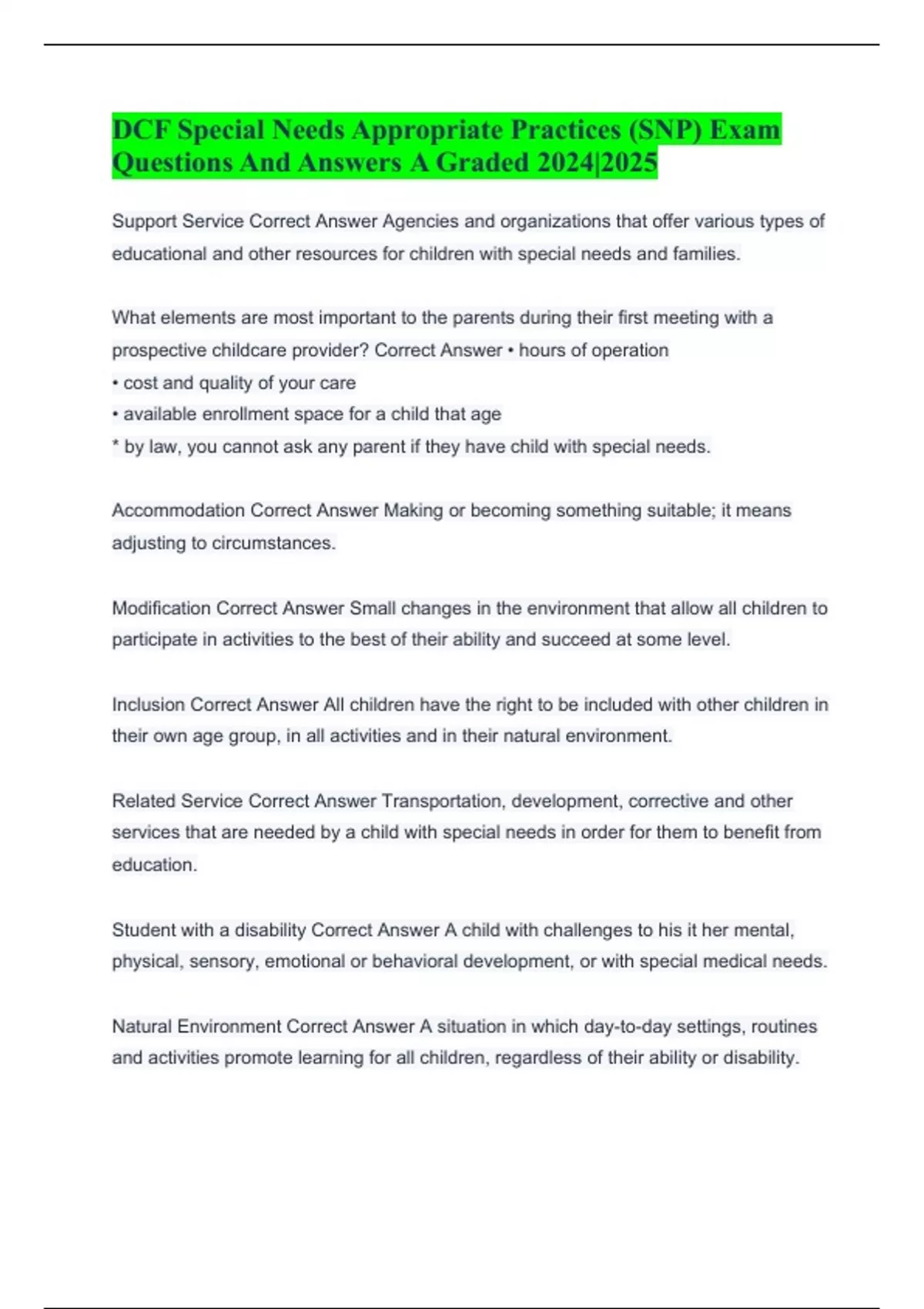Special Needs Appropriate Practices (SNP) DCF Exam Questions With Verified Answers 2024 DCF Special Needs Appropriate Practices Exam |Questions With 100% Correct Solutions 2024 DCF Special Needs Appropriate Practices (SNP) Updated Exam Questions With Verified Answers 2024 DCF Special Needs Appropriate Practices (SNP) Exam Questions And Answers A Gr