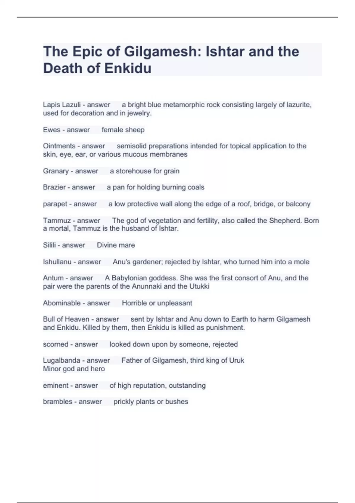 The Epic of Gilgamesh Questions and Answers 2024