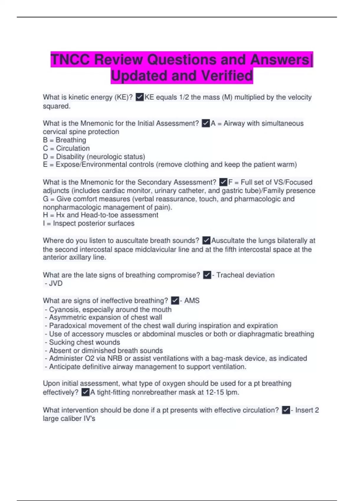 Elevate your trauma nursing expertise with our comprehensive Trauma Nursing Core Course (TNCC) Questions and Answers Package. Designed for healthcare professionals seeking to excel in the dynamic field of trauma nursing, this package is a vital resource for TNCC certification preparation and ongoing skill enhancement.