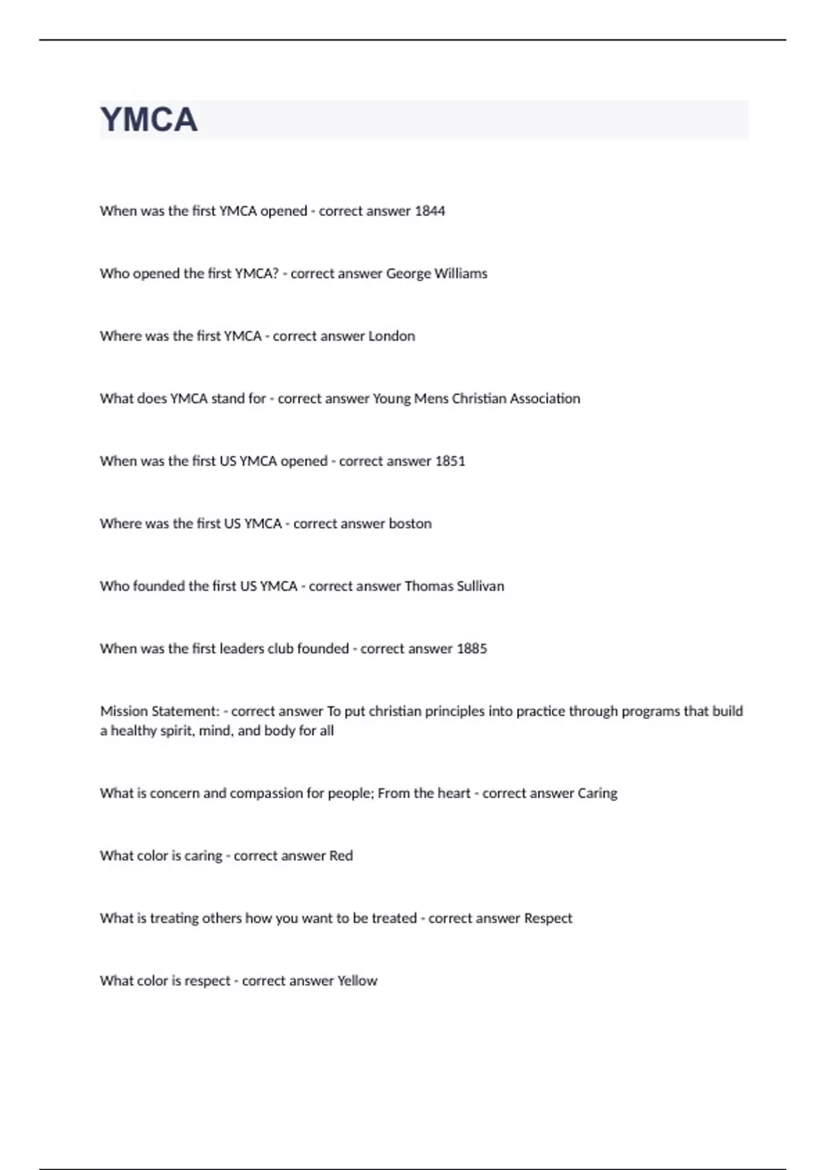 YMCA History Test Guide Questions 2024.
