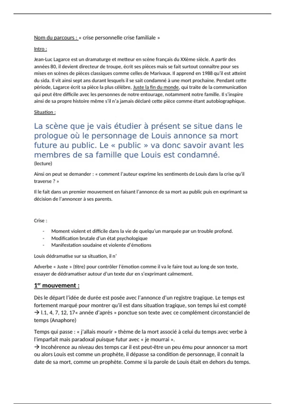 Fiche de Révision pour le Bac de Français, Prologue de Juste la Fin du Monde, Jean Luc Lagarce