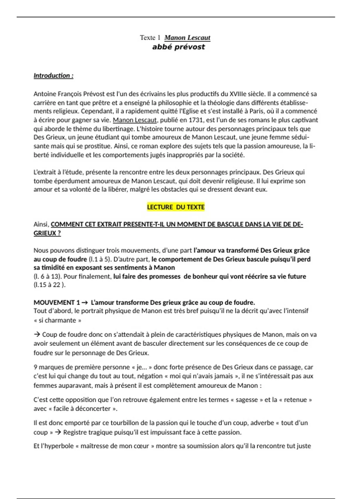 Fiche de révision pour l'oral du bac de Français, Extrait 1 de Manon Lescaut "Rencontre à Amiens", Abbé Prévost