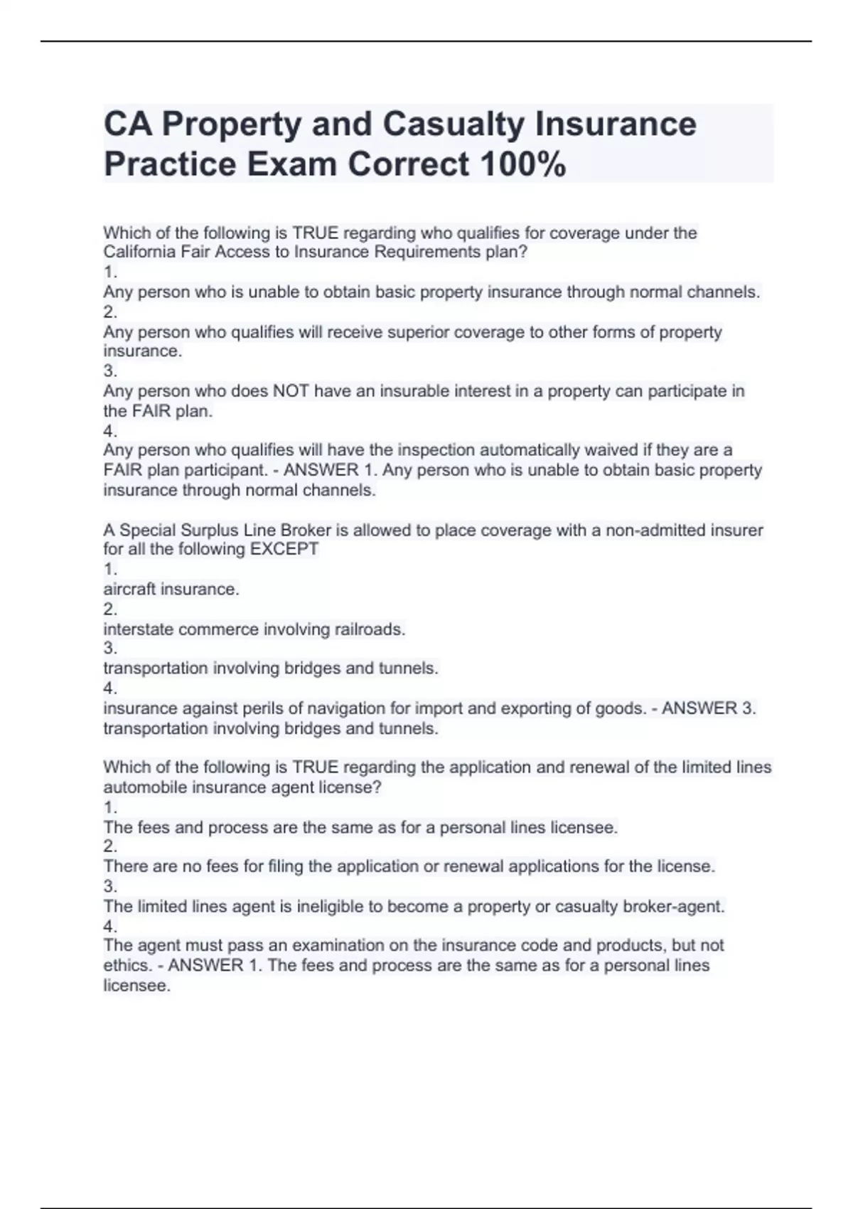 Property and casualty insurance Exam Questions and Answers