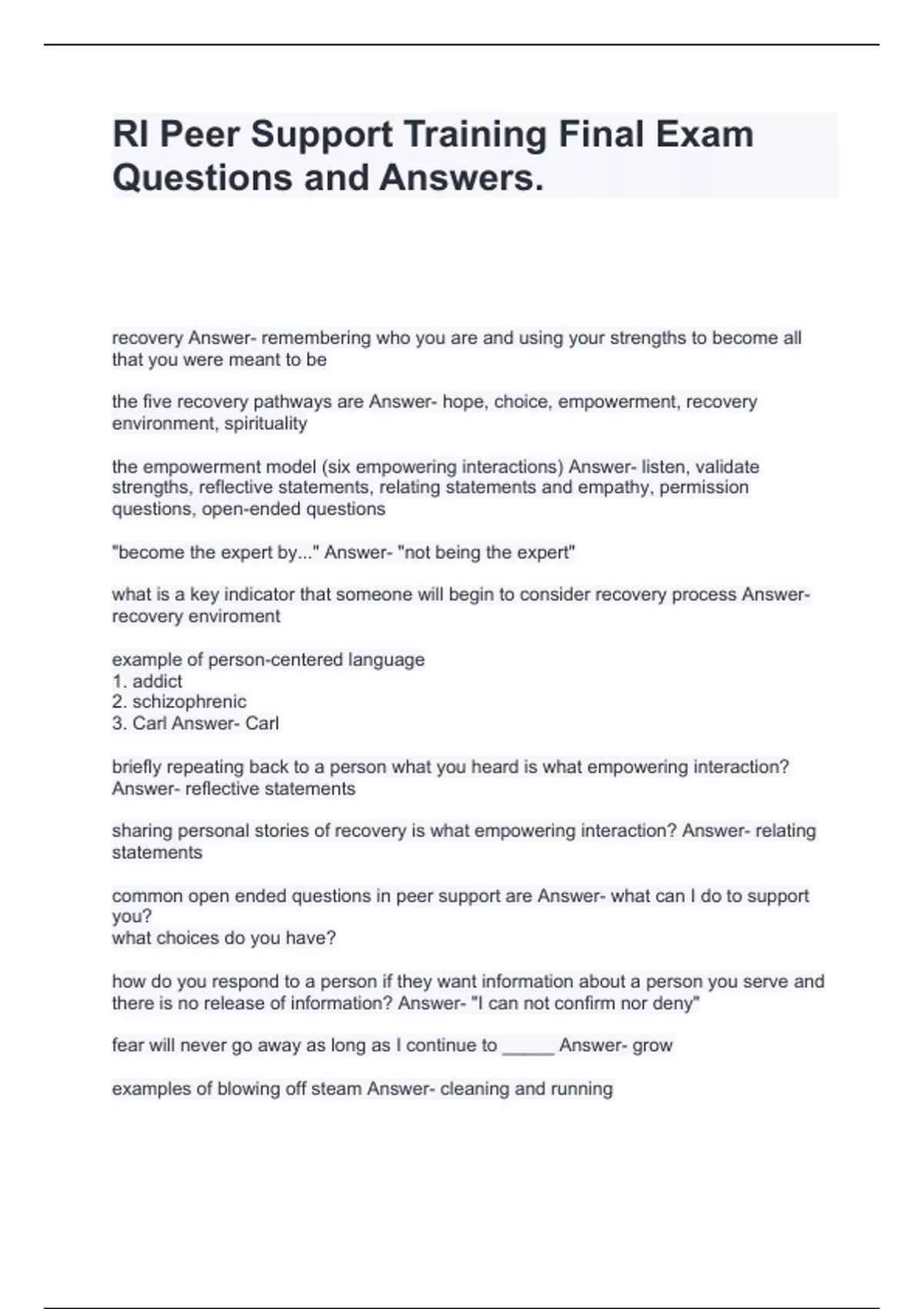 RI Peer Support Training Final Exam Questions and Answers,PSS # 1 Exam Questions and Answers,Peer Support Training Study Questions and Answers,Peer Support Specialists CPS Exam Questions and Answers,Peer Support Specialist Exam Questions and Answers,Peer Support Specialist Exam 1 Questions and Answers,Peer Support Exam Questions and Correct Answer