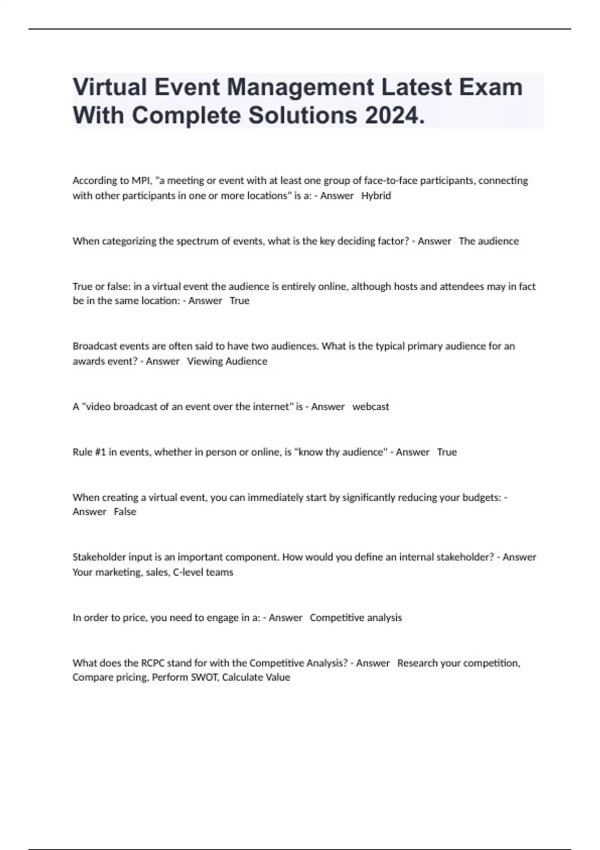 1 Exam (elaborations) Cvent Certification Final Exam Well Answered Rated A+ 2024. 2 Exam (elaborations) Cvent Certification Test Quizess And Verified Answers 2024. 3 Exam (elaborations) Cvent Certification, Event Management Actual Exam And Complete Answers 2024. 4 Exam (elaborations) Cvent Client Services Training Exam And Correct Answers 2024.