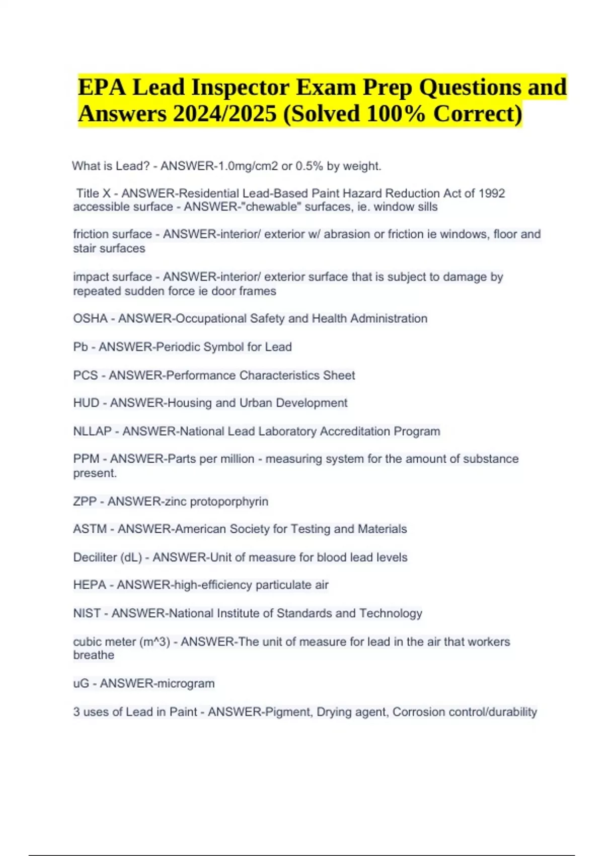 EPA Lead Inspector Exam Questions With Answers 2024/2025 | EPA Lead Inspector Exam Prep Questions and Answers and EPA LEAD INSPECTOR FINAL EXAM QUESTIONS WITH VERIFIED ANSWERS 2024/2025 | SOLVED