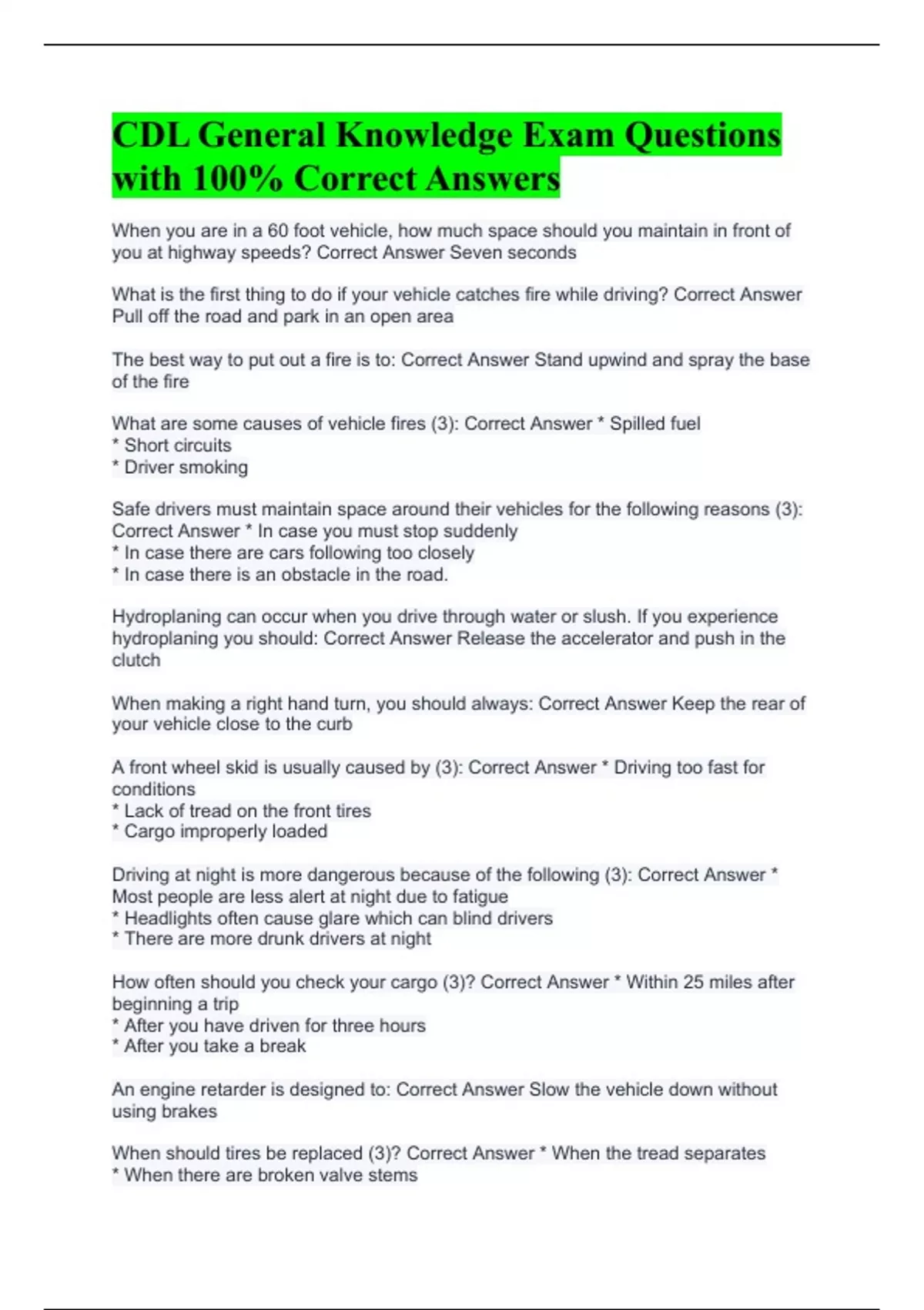 CDL General Knowledge Exam Questions with 100% Correct Answers CDL Class B Quiz Questions with 100% Correct Answers CDL Practice Test Exam Questions with 100% Correct Answers CDL General Knowledge Exam Questions with 100% Correct Answers CDL Practice Test (General Knowledge) Questions with 100% Correct Answers