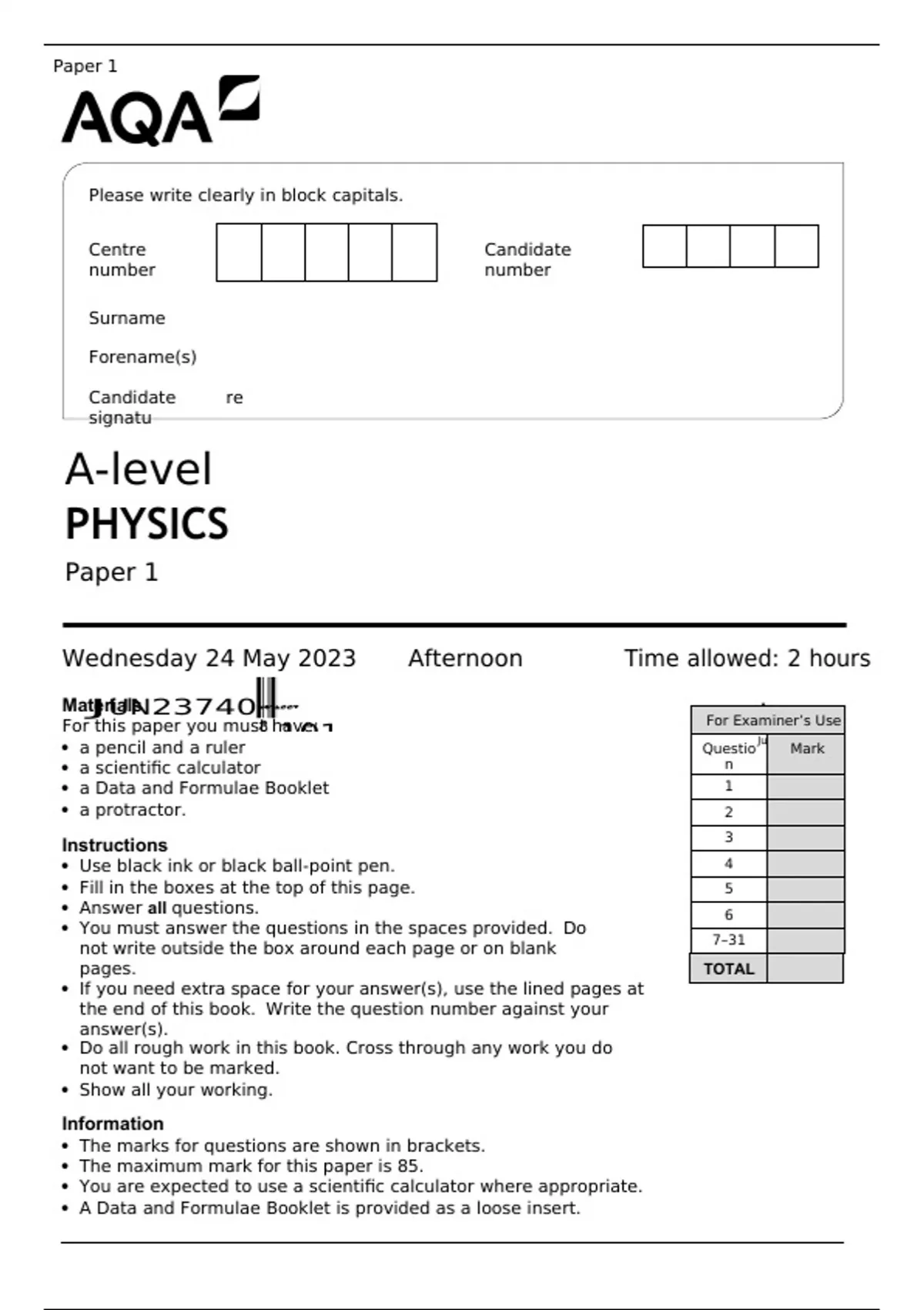 AQA A-level PHYSICS Question Paper 1 May 2023