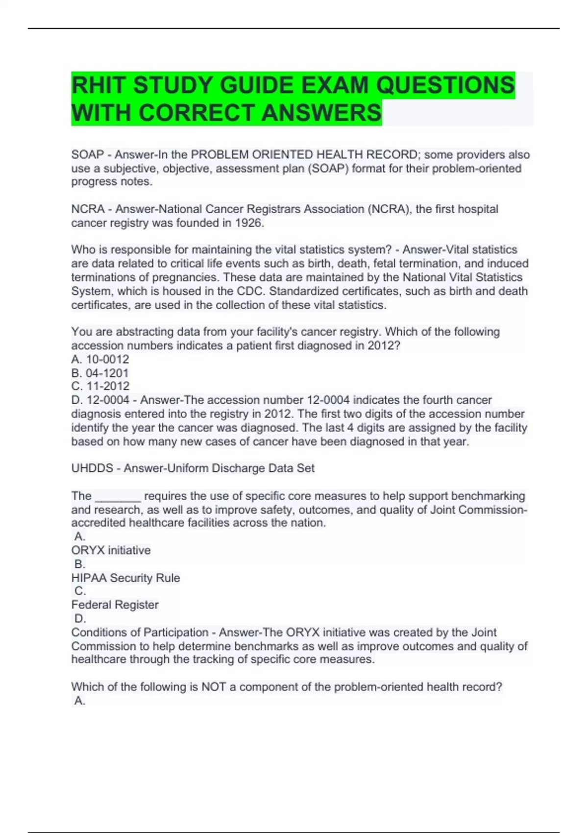 AHIMA RHIT Practice Exam Questions with Correct Answers 2 Exam (elaborations) DOMAIN 6: Leadership Questions with Correct Answers 3 Exam (elaborations) Registered Health Information Technician (RHIT) Exam Preparation Questions with Complete Solutions 4 Exam (elaborations) RHIT Actual Exam Prep Questions with Correct Answers 5 Exam (elaborations