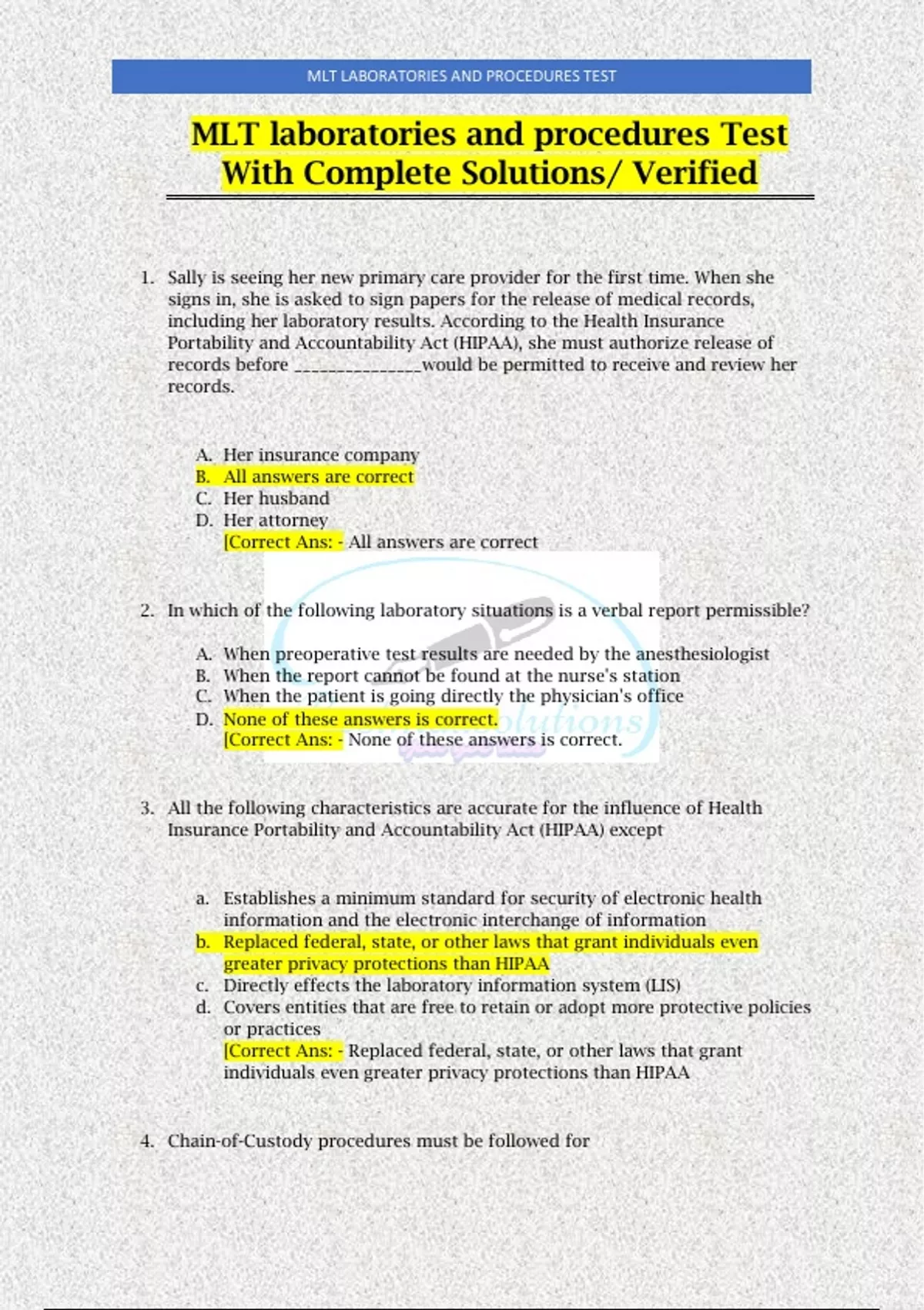 Complete; MLT laboratories and procedures /MLT Laboratory Operations BOC Exam With Verified Answers