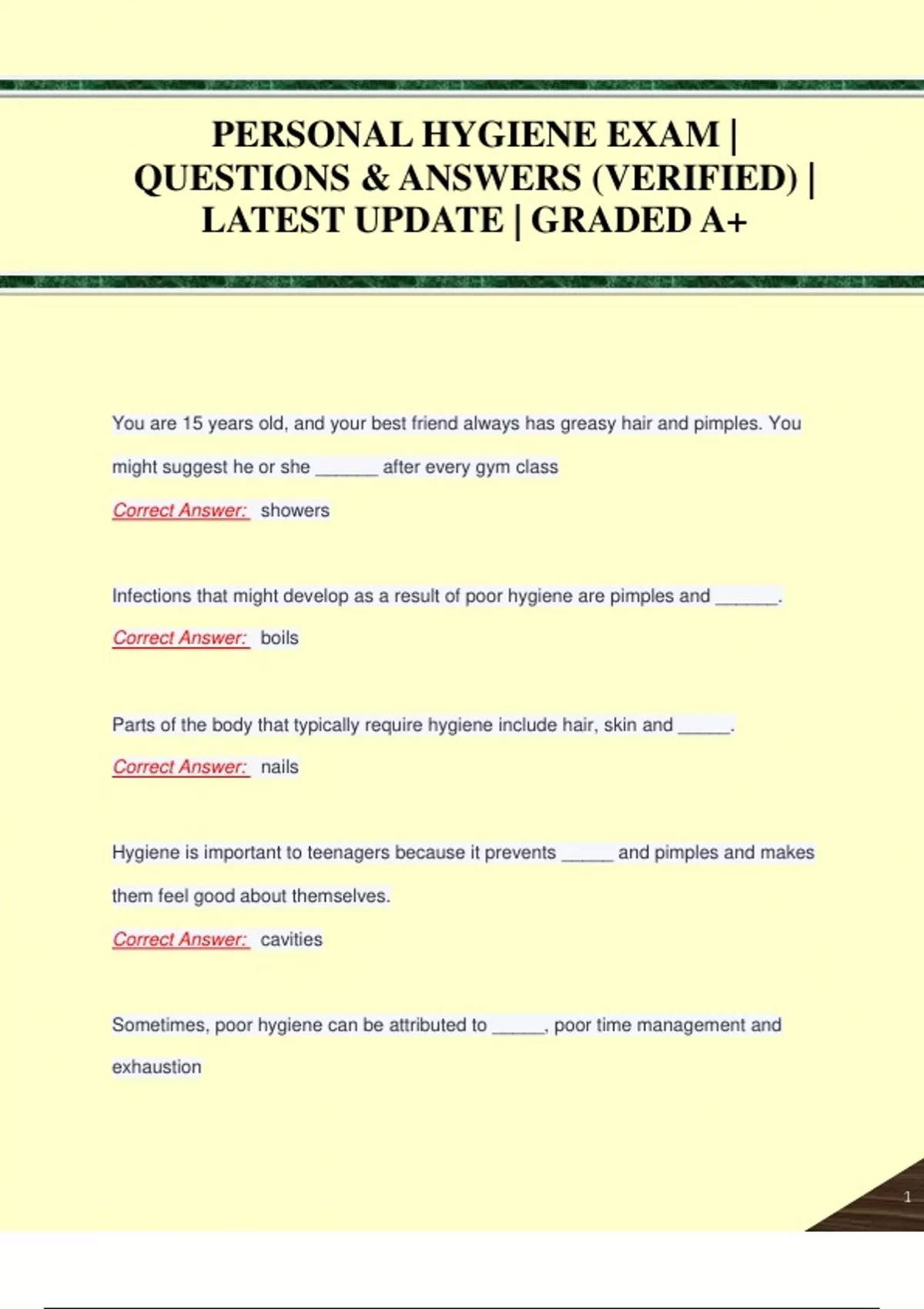 PERSONAL HYGIENE EXAM PACK | QUESTIONS & ANSWERS (VERIFIED) | LATEST UPDATE | GRADED A+