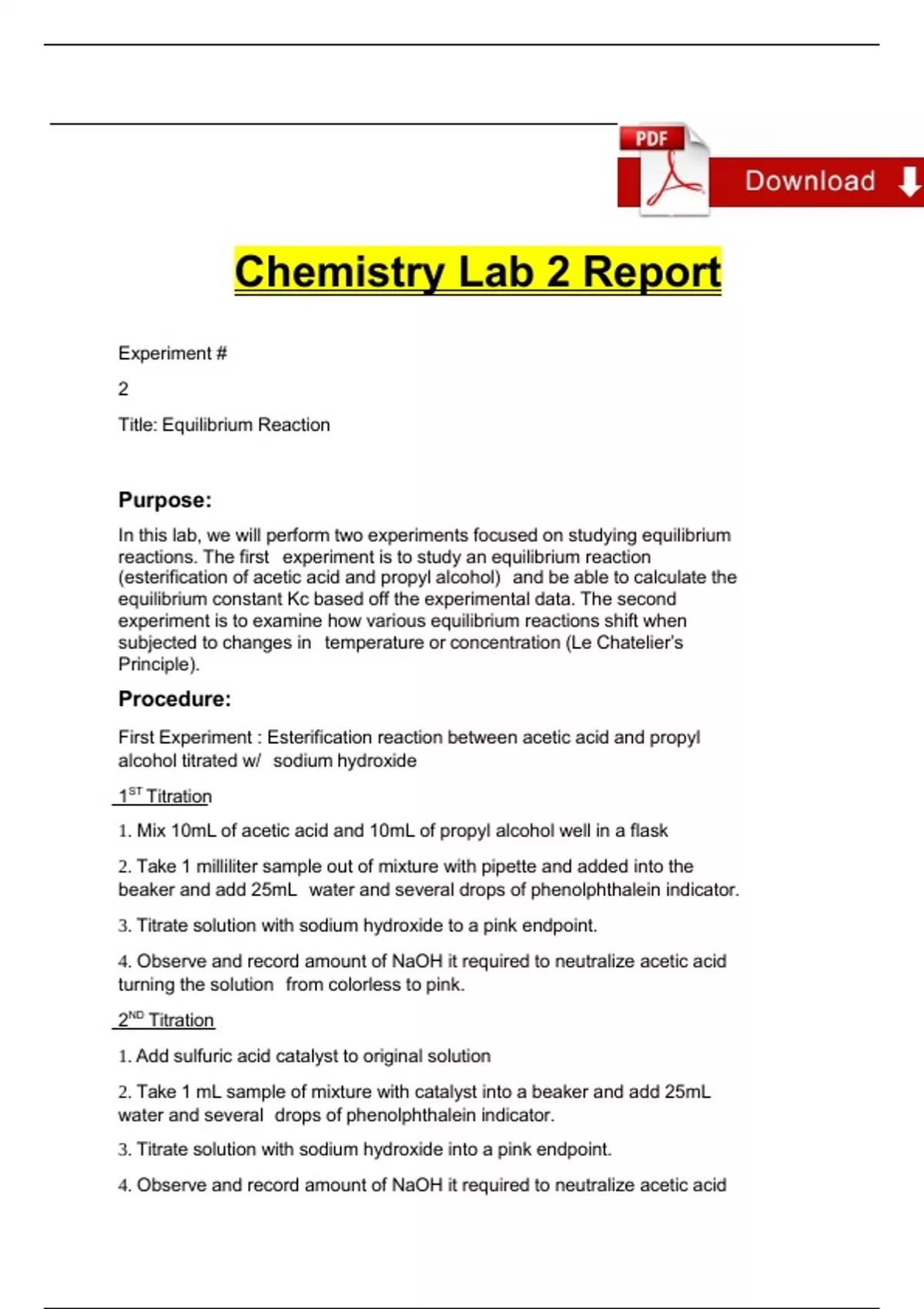 Summary CHEM 104 LAB 2 Report Equilibrium Reactions Complete 2024 / 2025 | 100% Verified