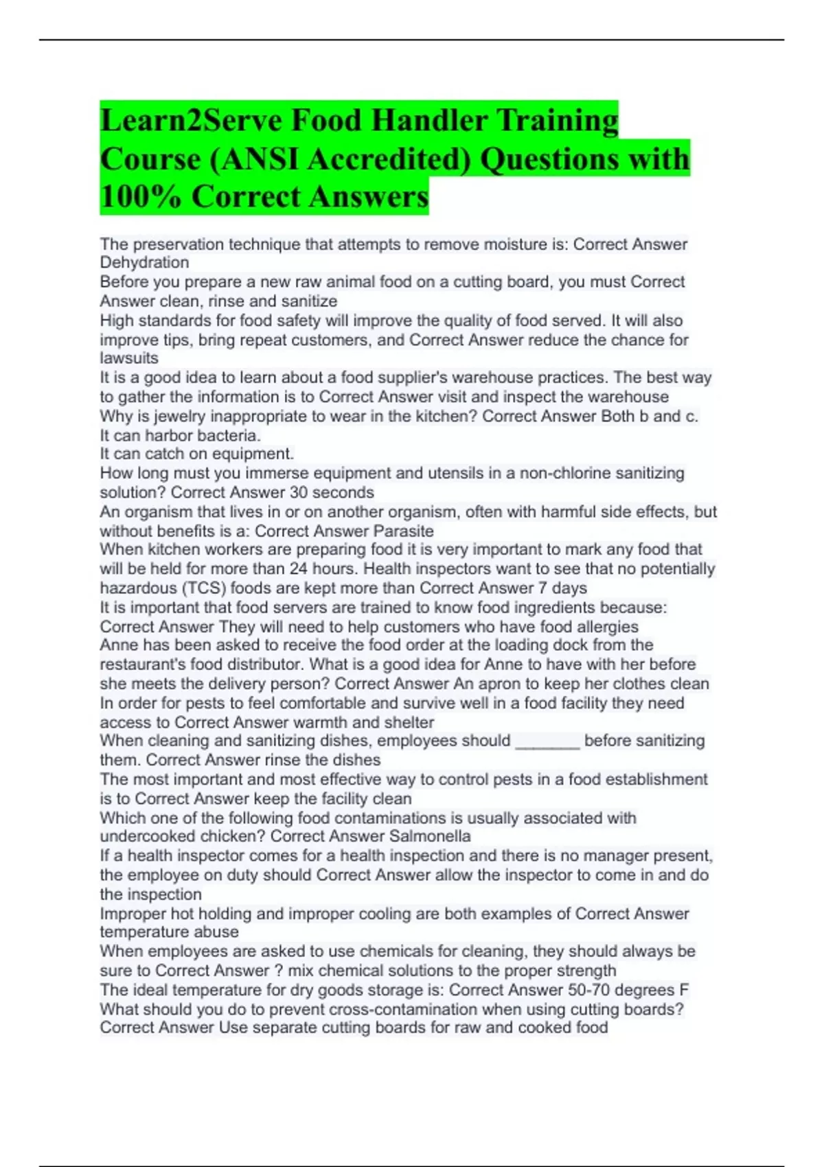 Learn2Serve Food Handler Training Course (ANSI Accredited) Questions with 100% Correct Answers Learn2Serve Manager Certification Questions with Correct Answers Learn2serve Food Handlers Questions with 100% Correct Answers Learn2Serve Food Safety Protection Manager Certification Questions with Correct Answers Learn2Serve Food Manager Certification Q