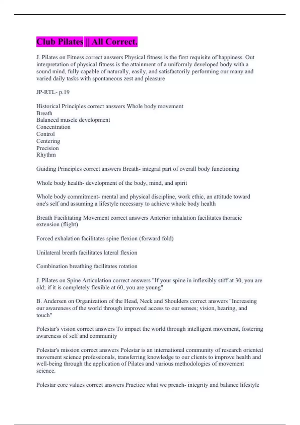 Club Pilates ALL Quiz Questions || with 100% Verified Solutions. Club Pilates Teacher Training || A+ Verified Solutions. Pilates Special Populations || Questions and 100% Accurate Answers. CP Final Written Test (All Answers Are Correct 100%)