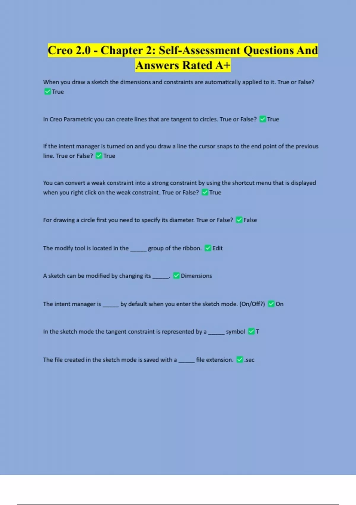 Package Deal For Creo Study Solutions With Fully Curved Solutions PTC Creo Simulate Exam 1 Check Your Knowledge Module 1-9 | Questions And Answers Creo Certification Test - Part 2 Complete Questions And Answers With Verified Solutions CREO/CREO AMP Quizlet (Globus) Questions And Answers With Latest Quiz