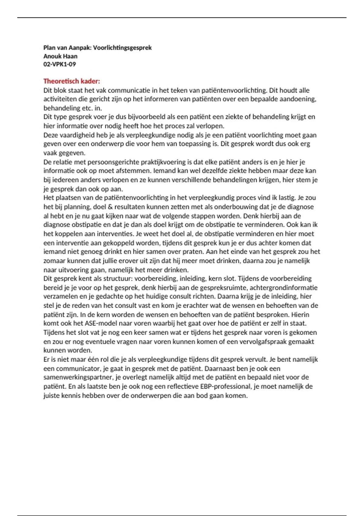 Hierbij de bundel met een goedgekeurd plan van aanpak en gespreksanalyse voor het tentamen van Comf3. Het gaat hierbij om het voeren van een voorlichtingsgesprek.
