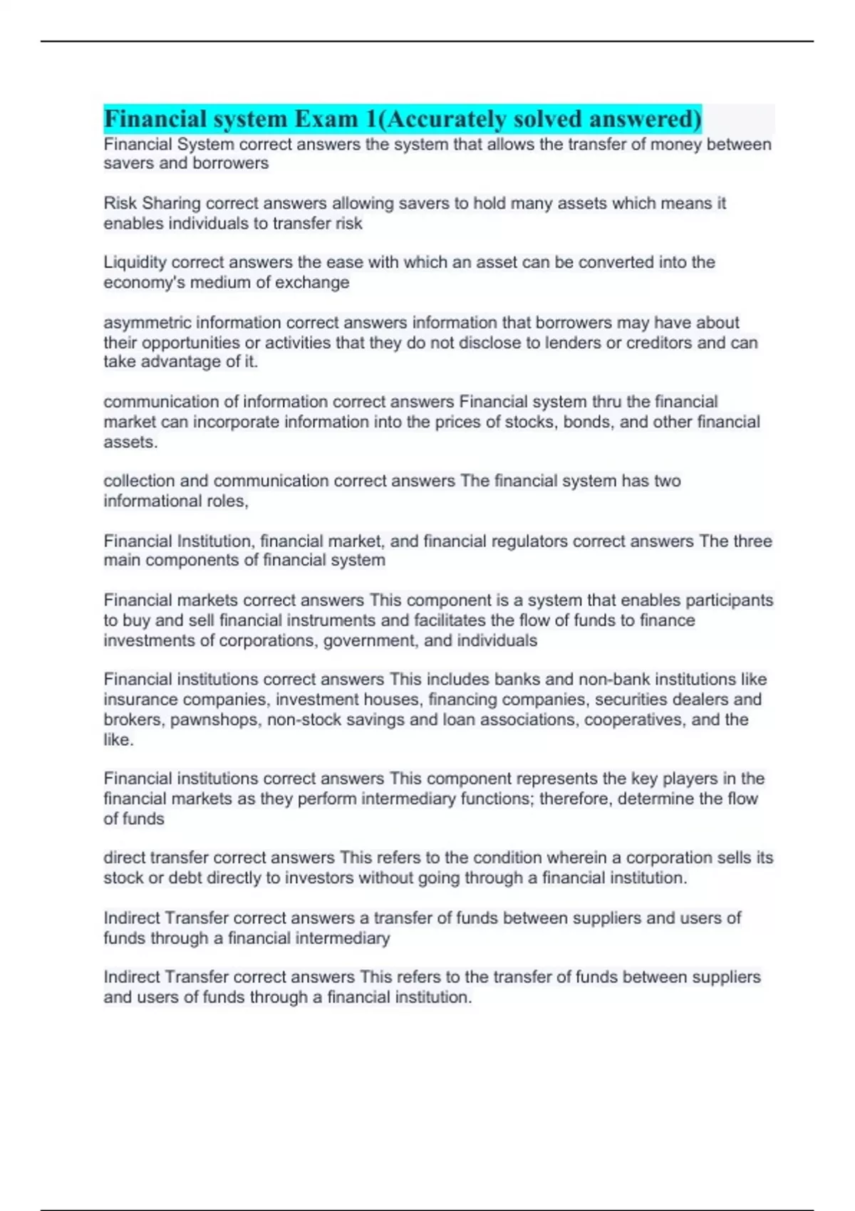 Financial system Exam 1(Accurately solved answered)