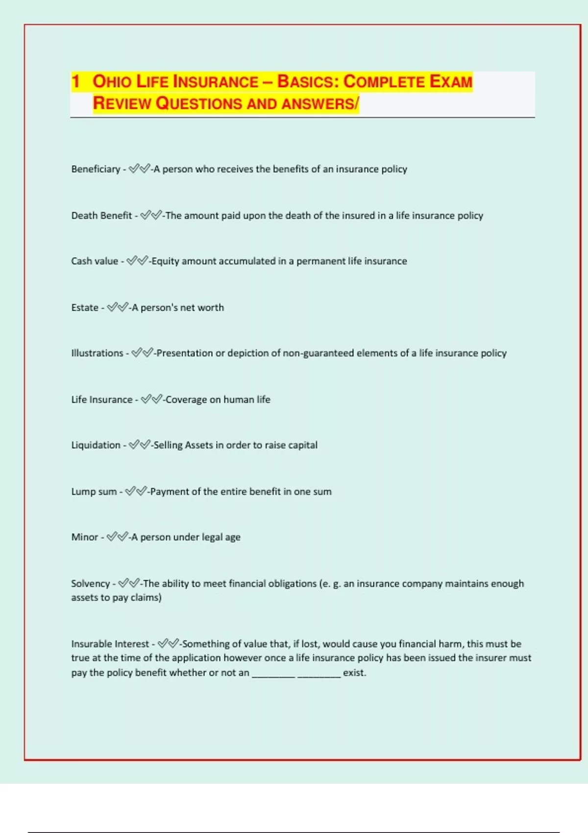 1 OHIO LIFE INSURANCE – BASICS: COMPLETE EXAM REVIEW QUESTIONS AND ANSWERS/