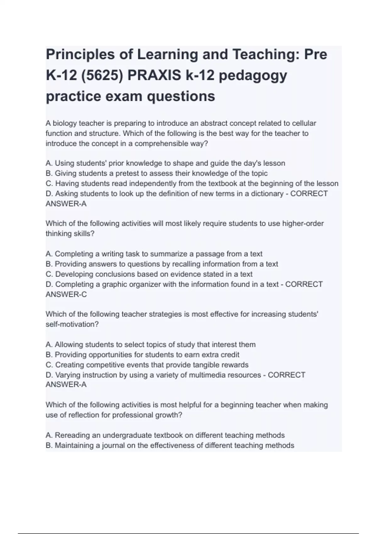 PRAXIS 5622 PLT Practice questions and answers