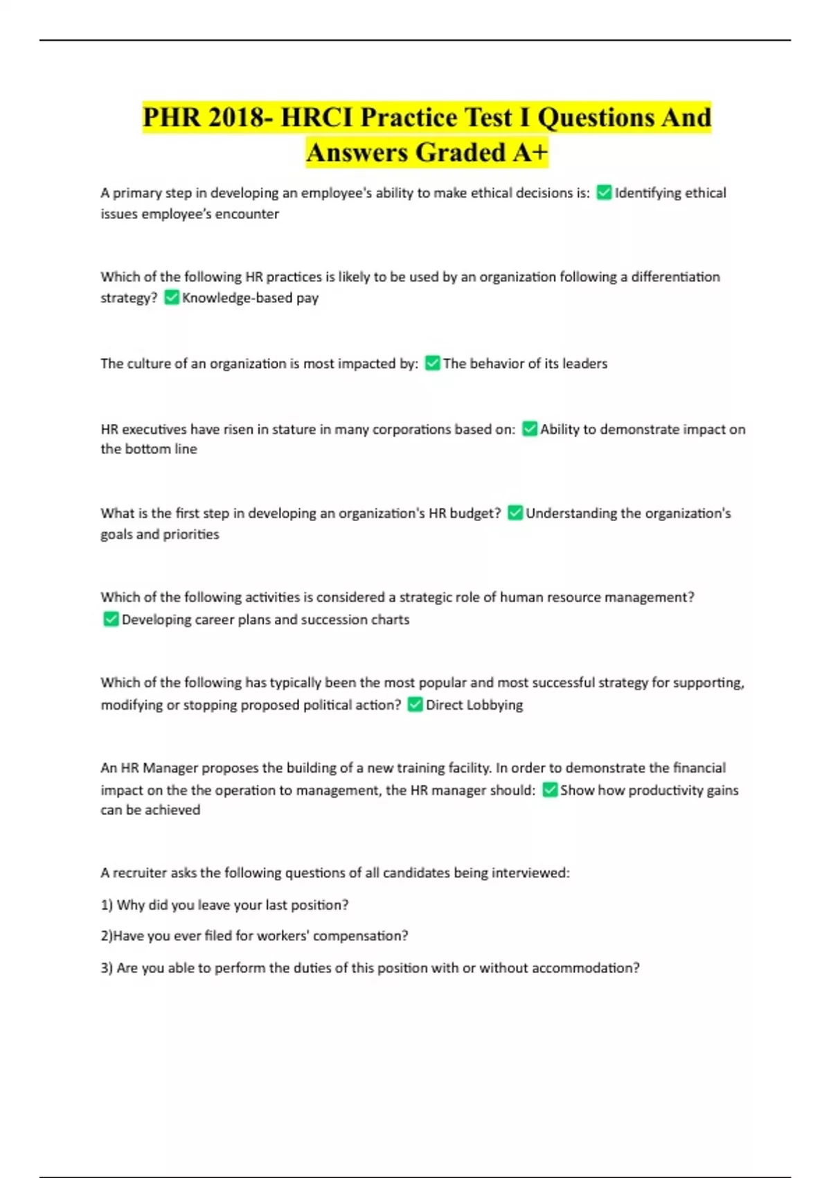 Package Deal For PHR With Complete Study Questions And Answers 2024 /2025 Complete Pack PHR Practice Test Questions And Answers With Verified Study Solutions PHR Learning And Development Practice Test Complete Questions And Answers