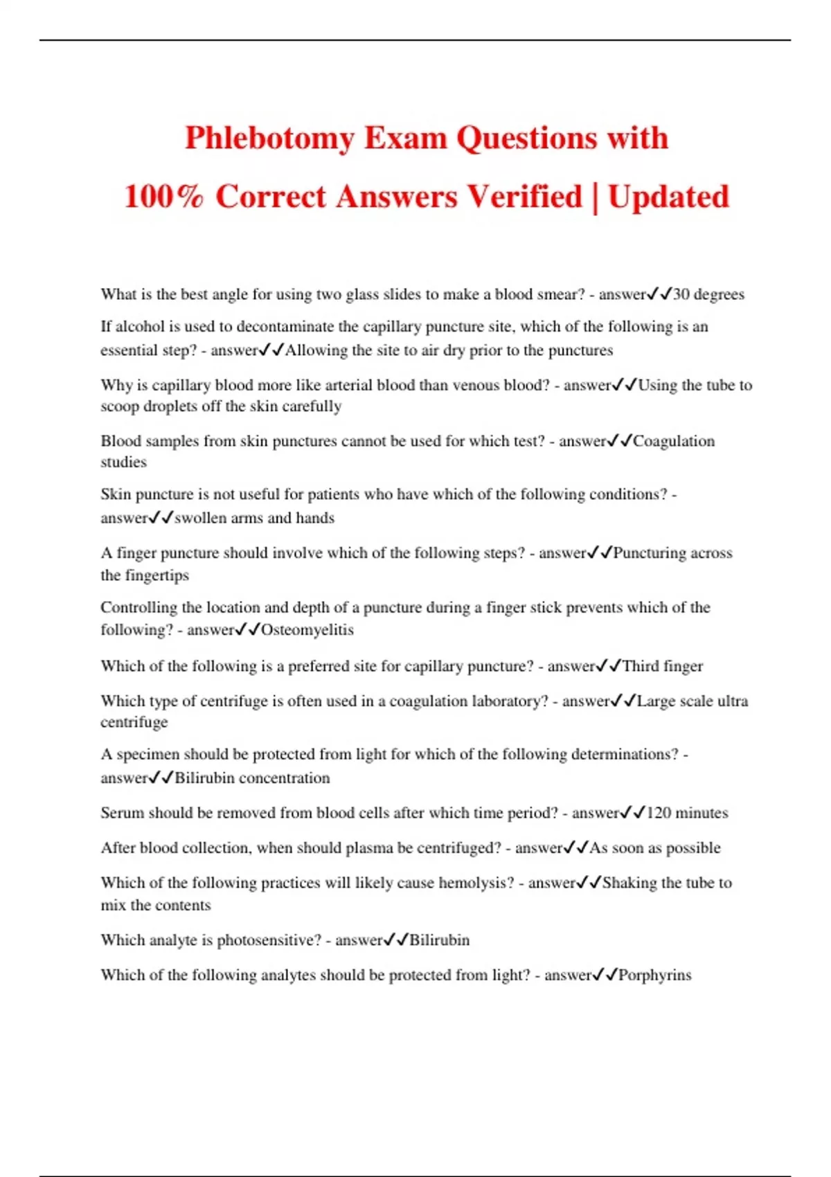 Phlebotomy Exam Questions And Answers 100% Verified 2024/2025