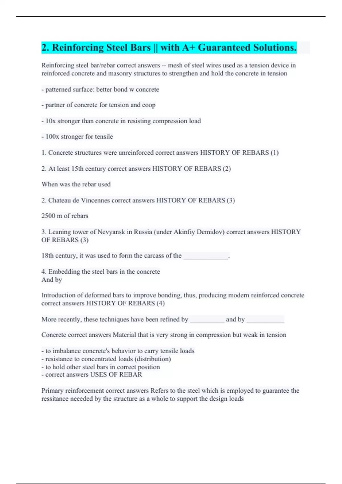 SECTION 5. MASONRY- REINFORCING STEEL || QUESTIONS AND 100% ACCURATE ANSWERS. 2. Reinforcing Steel Bars || with A+ Guaranteed Solutions. B.T. REINFORCED CONCRETE AND STEEL REINFORCEMENT VALUES || A Verified A+ Pass. BT - STEEL BARS || with Error-free Solutions. BUILDING TECH.: REINFORCEMENT CONCRETE + STEEL CONSTRUCTION || with Complete Solutions.