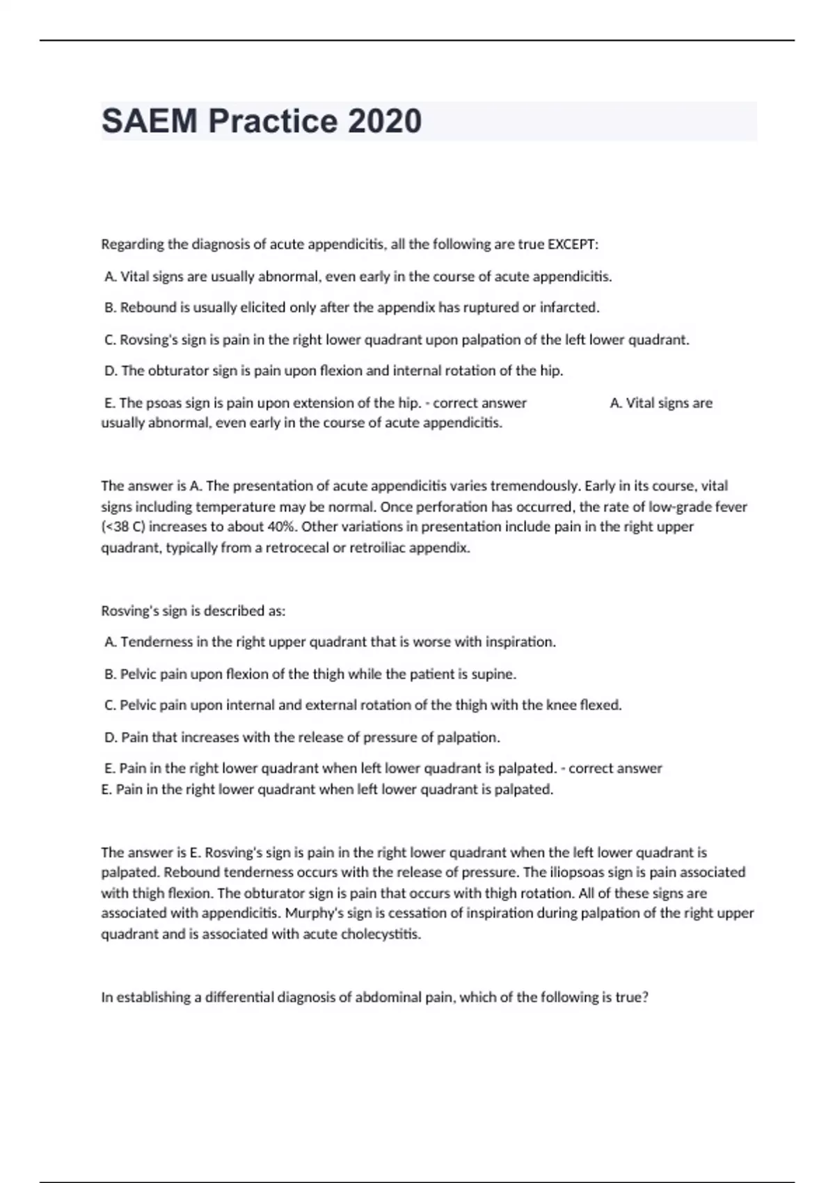 1 Exam (elaborations) Optho, Foreign Bodies, SAEM AMS, 2017 CV, 2017 trauma, SAEM MISC, SAEM - Shock and Sepsis, Environment and Endocrine, Pulm Emergencies Practice Exam With Complete Answers Graded A+. 2 Exam (elaborations) GI Bleeding, Chest Pain, Headache and Neurologic, SAEM Peds, SAEM - Procedures, Psych Emergencies, Derm, SAEM Tox, Infxn, O