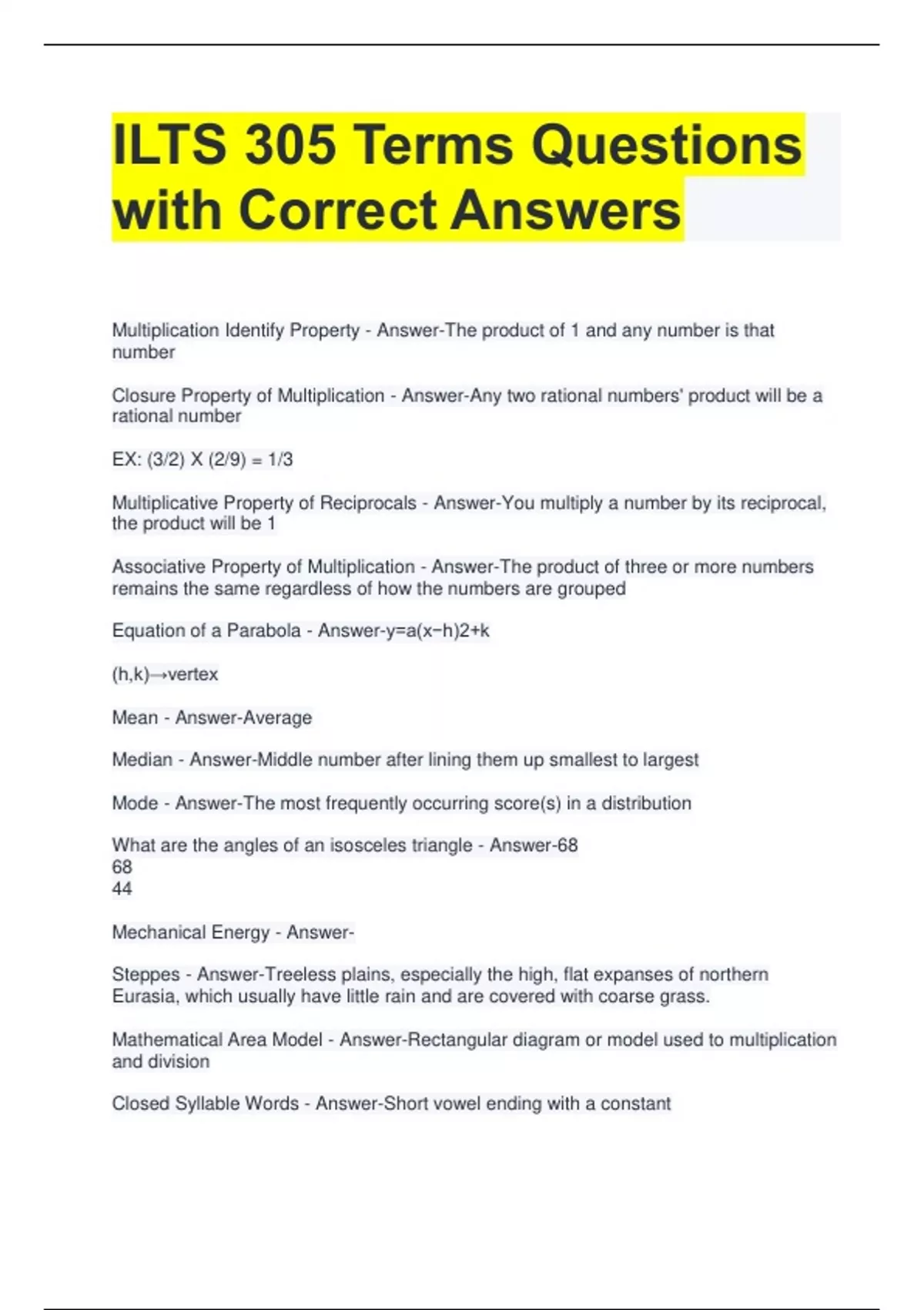 1 Exam (elaborations) ILTS 305 Exam Questions with Correct Answers 2 Exam (elaborations) ILTS 305 Exam Questions with Complete Solutions 3 Exam (elaborations) ILTS 305 Exam Questions with All Correct Answers 4 Exam (elaborations) ILTS 305 Practice Test Questions with Correct Answers 5 Exam (elaborations) ILTS 305 Study Exam Questions and Correc