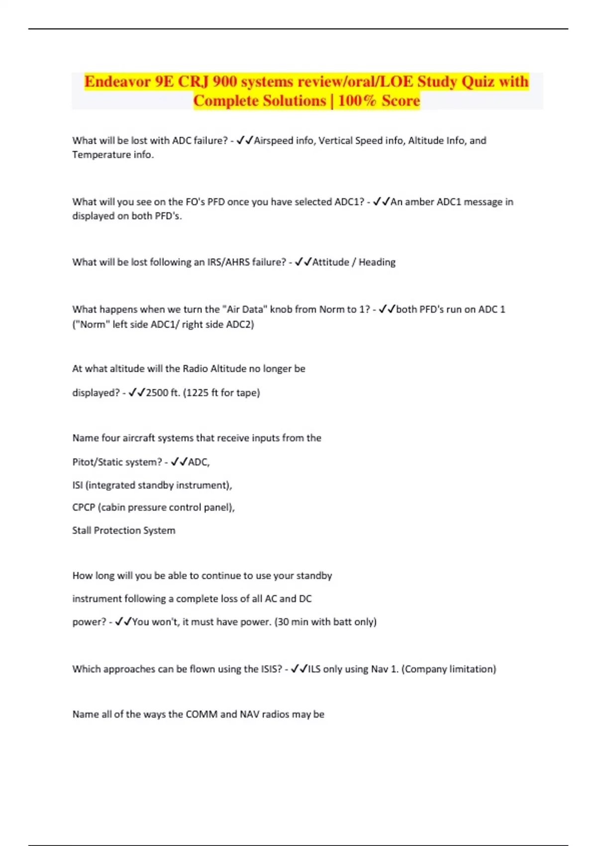 Endeavor Air CRJ 900 Systems Final Exam Study Guide with Complete Solutions | 100% Score
