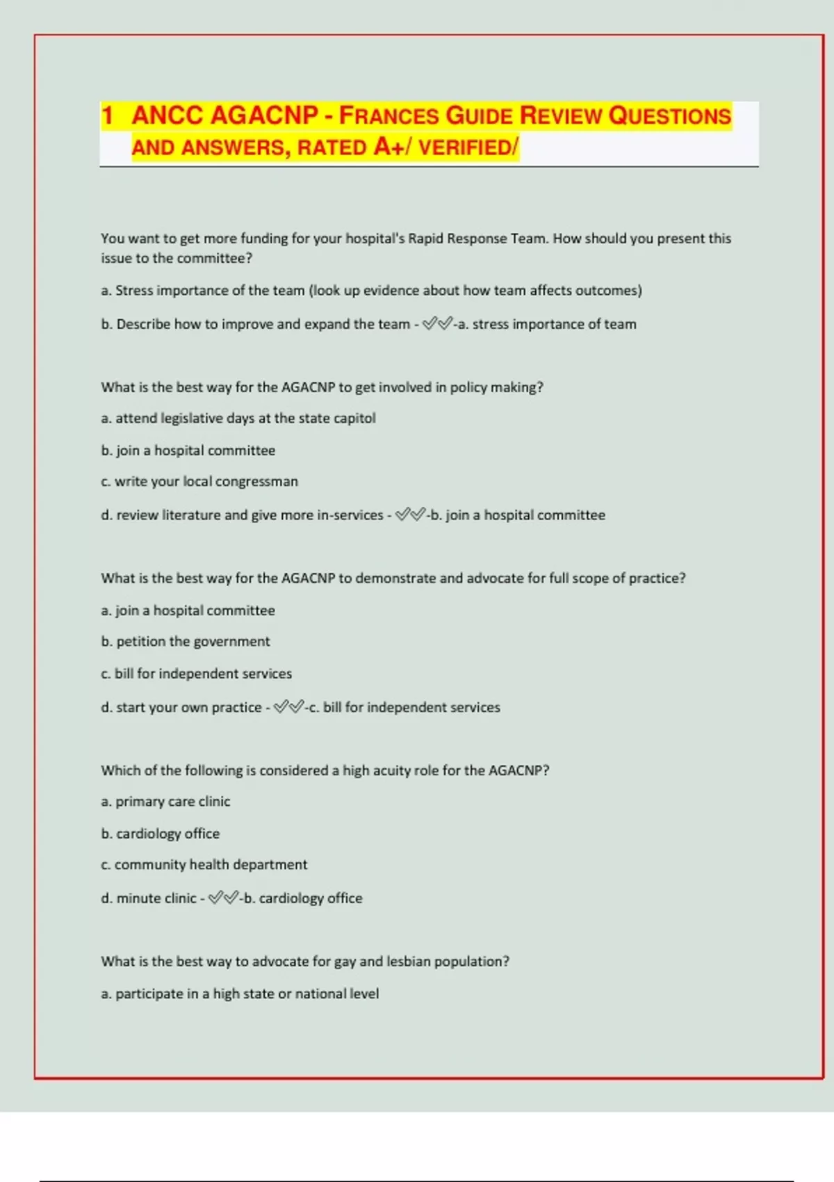 ANCC AGACNP - FRANCES GUIDE REVIEW QUESTIONS AND ANSWERS, R| LATEST UPDATES 2024/25 APPROVED| ATED A+/ VERIFIED/