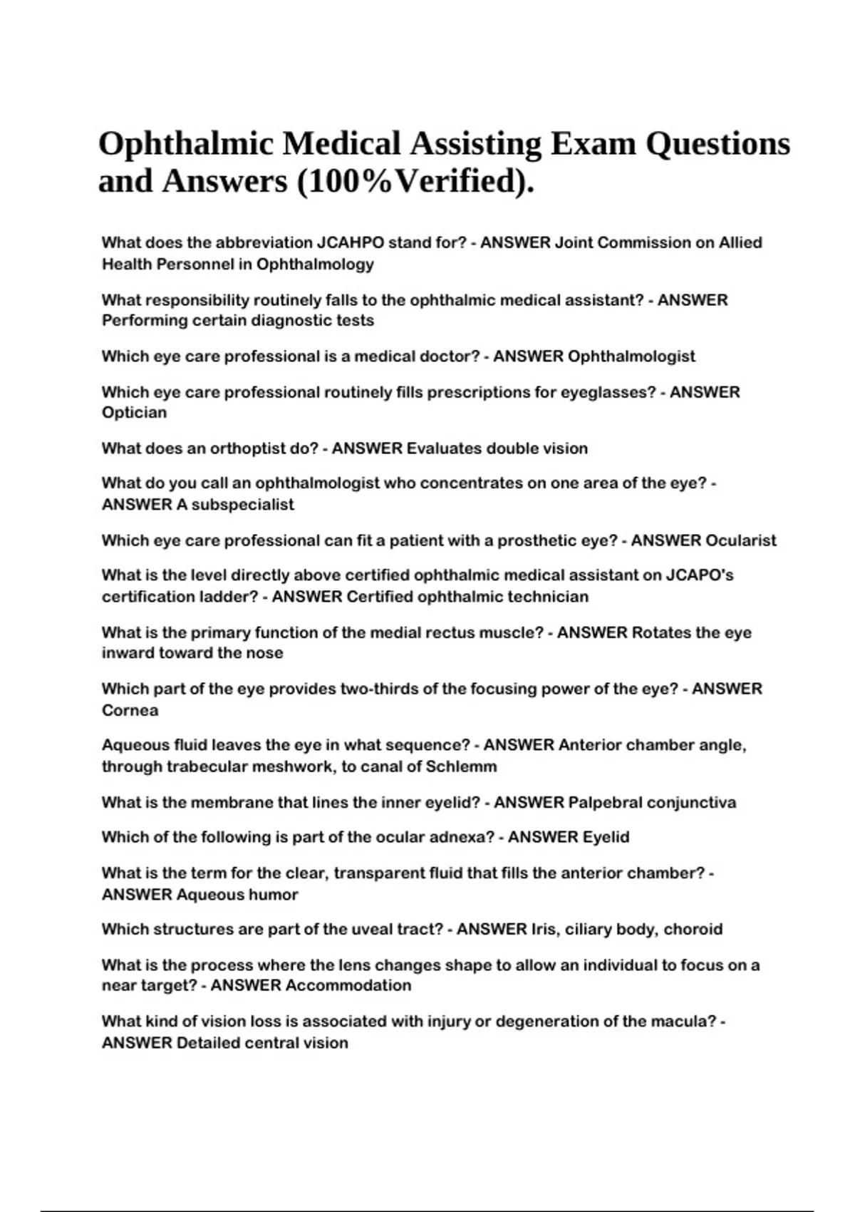 Ophthalmic Medical Assisting Exam Q & A 2024, Ophthalmic Medical Assisting Exam 2024 With 100%Correct Answers, Ophthalmic Medical Assisting Exam Questions and Answers (100%Verified) & Certified Ophthalmic Assistant Exam | 190 Questions And Answers (100% V