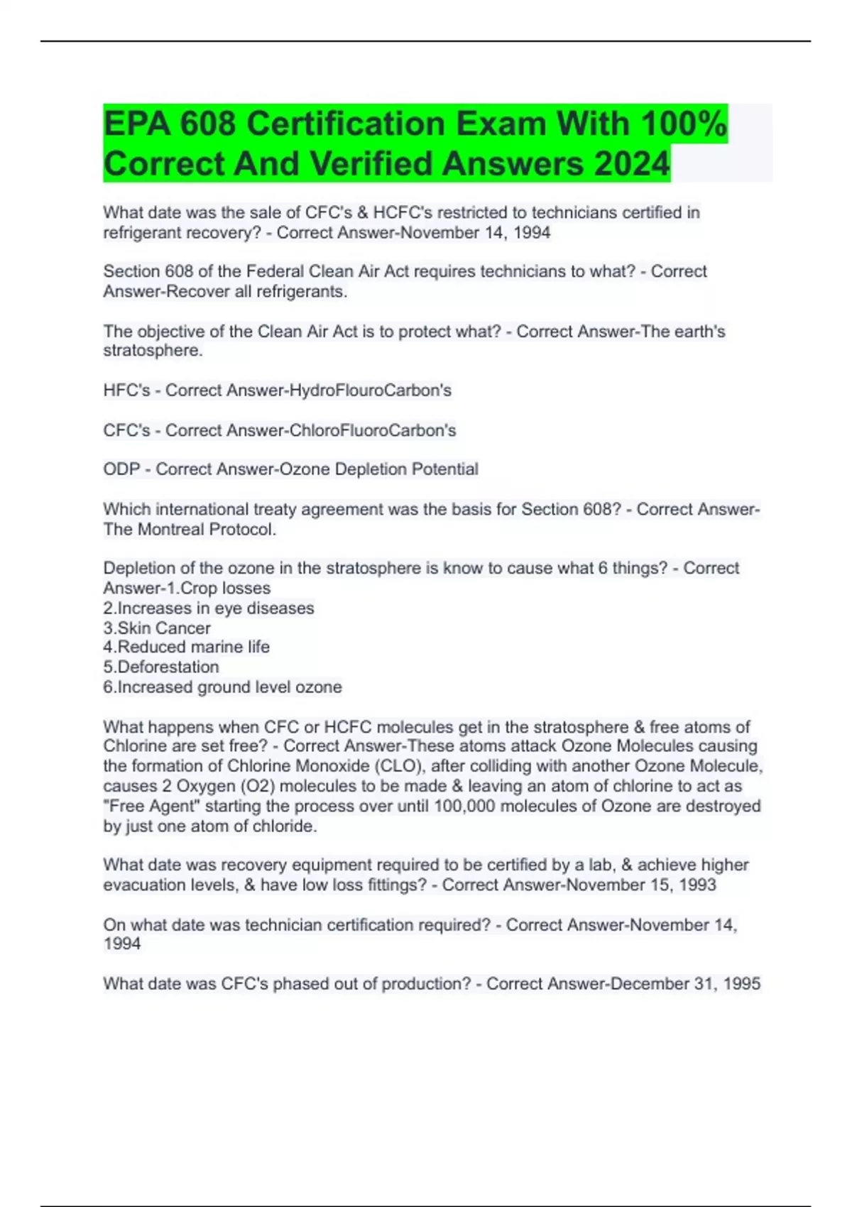 Epa 608 2024 Exam Updated With 100% Correct And Verified Answers EPA 608 Type 2 Practice Exam With 100% Correct And Verified Answers EPA 608 9th Edition Exam With 100% Correct And Verified Answers EPA 608 Certification Exam With 100% Correct And Verified Answers 2024 Epa 608 Universal Exam With 100% Correct And Verified Answers 2024