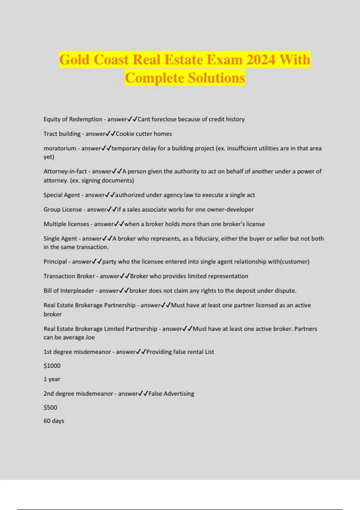 Gold Coast Real Estate Exam 2024 With Complete Solutions