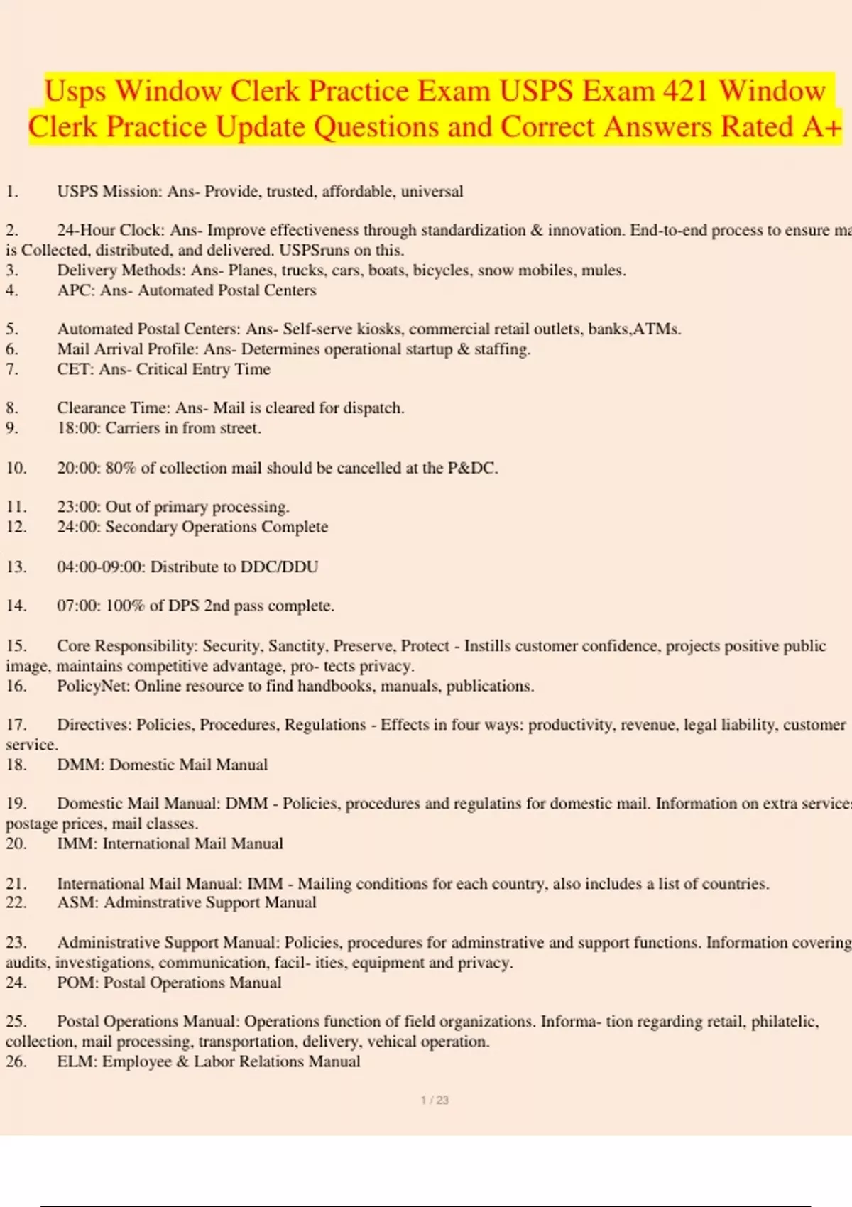 Usps Window Clerk Practice Exam USPS Exam 421 Window Clerk Practice Update Questions and Correct Answers Rated A+