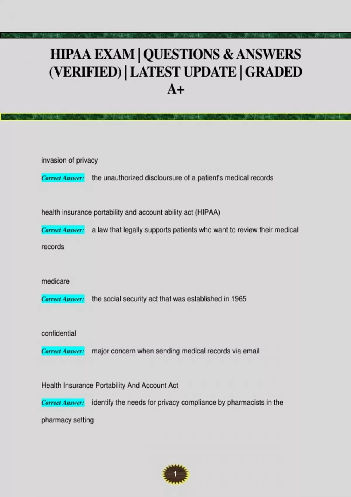 HIPAA TEST EXAM | QUESTIONS & ANSWERS (VERIFIED) | LATEST UPDATE | GRADED A+