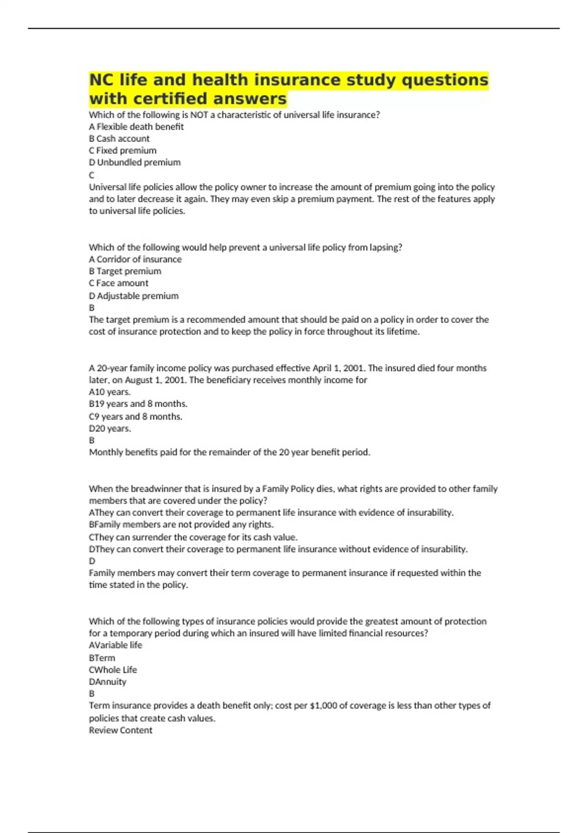 NC Life Insurance Exam Prep Questions and Answers Already Passed |A+ GRADED!!! 2 Exam (elaborations) NC Life Insurance Practice Exam Questions and Answers Already Passed !!!A+ Graded 3 Exam (elaborations) NC Life insurance state exam study guideline already graded A+|100% Complete 4 Exam (elaborations) NC LIFE insurance state exam questions and