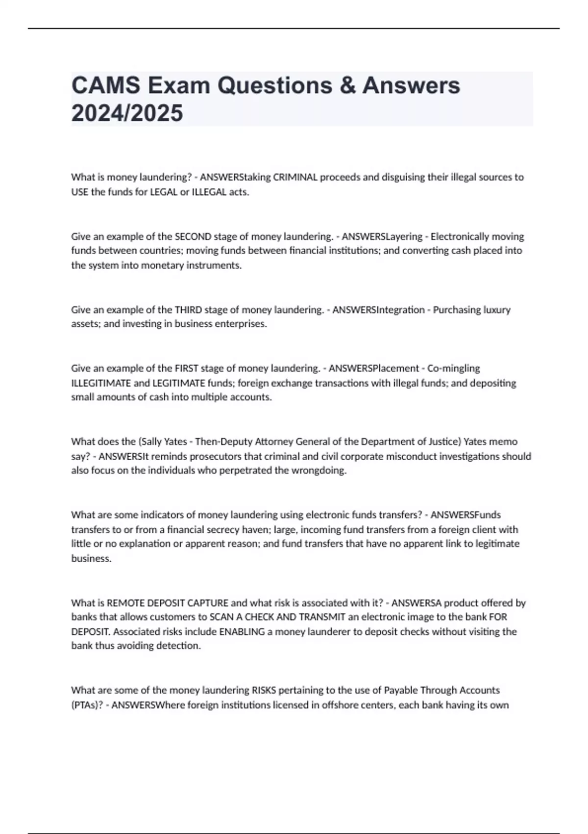 CAMS Final Exam Study Guide Questions & Answers 2024/2025