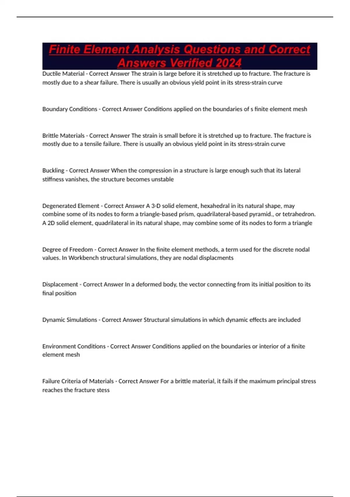 CAD 4145, Final Exam Questions and Correct Answers 2024,489 Midterm 1 FEM Study Questions and Correct Answers Verified 2024,Finite Element Analysis 4 Study Questions and Correct Answers 2024, Module 2: Finite Element Analysis (FEA) Questions and Correct Answers Graded A+ 2024 and Finite Element Modeling Study Questions and Correct Answers Verified