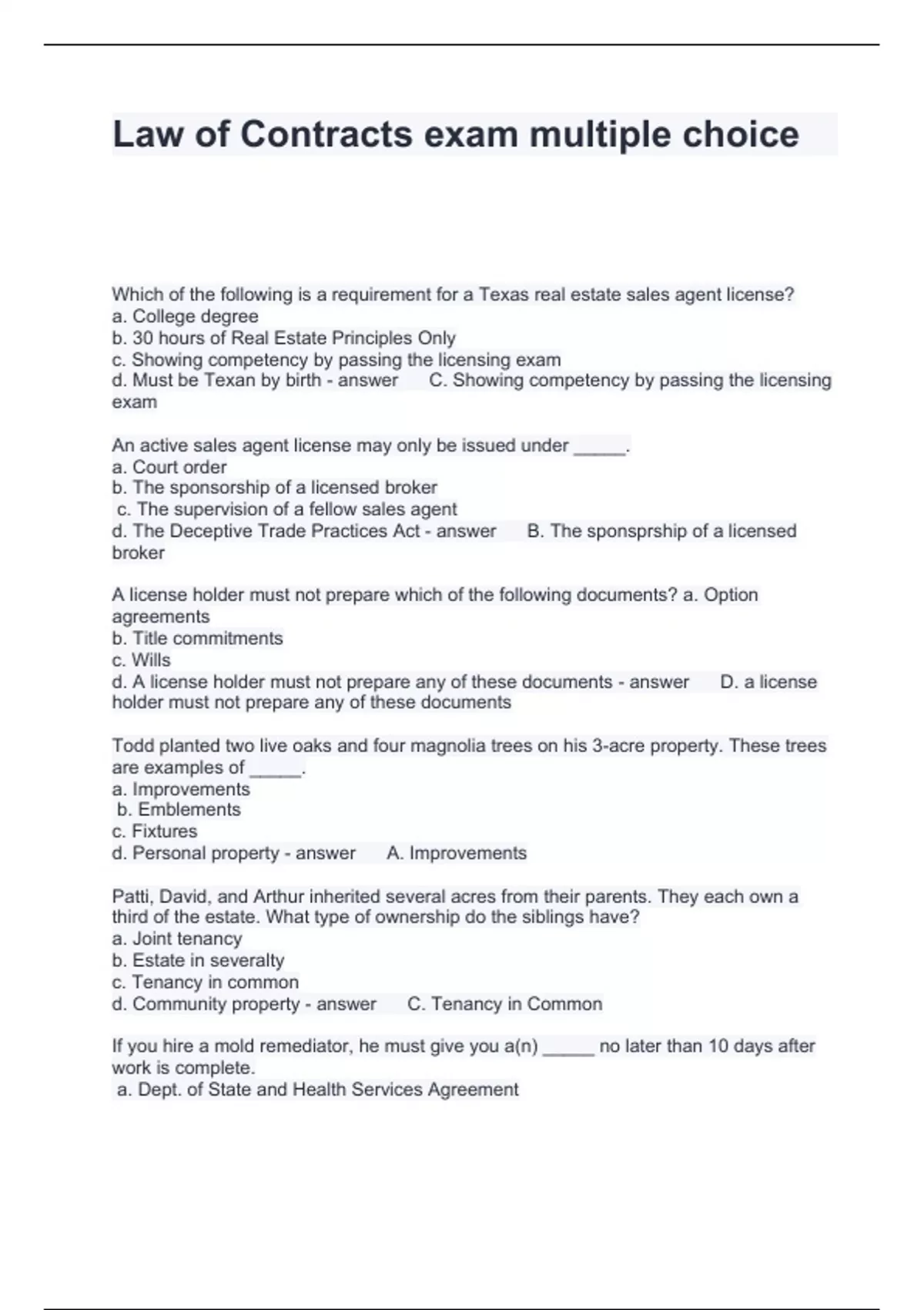 Exam (elaborations) Law of Contracts - #1251. FINAL EXAM Questions and Answers 100% Accurate Exam (elaborations) Chapter 10 - The Law of Contract Questions and Answers 2024 Exam (elaborations) Law of contracts-FINAL EXAM Questions and Answers Graded A+ Exam (elaborations) Texas Law of Contracts Unit 1 Exam Texas Contract Law Questions and An