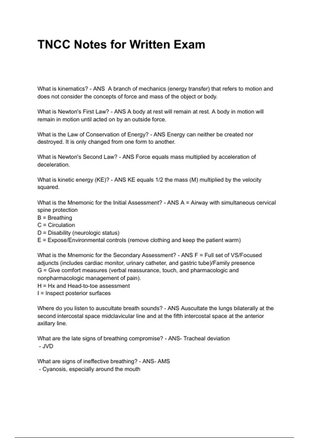TNCC Notes for Written Exam Questions With Complete Solutions