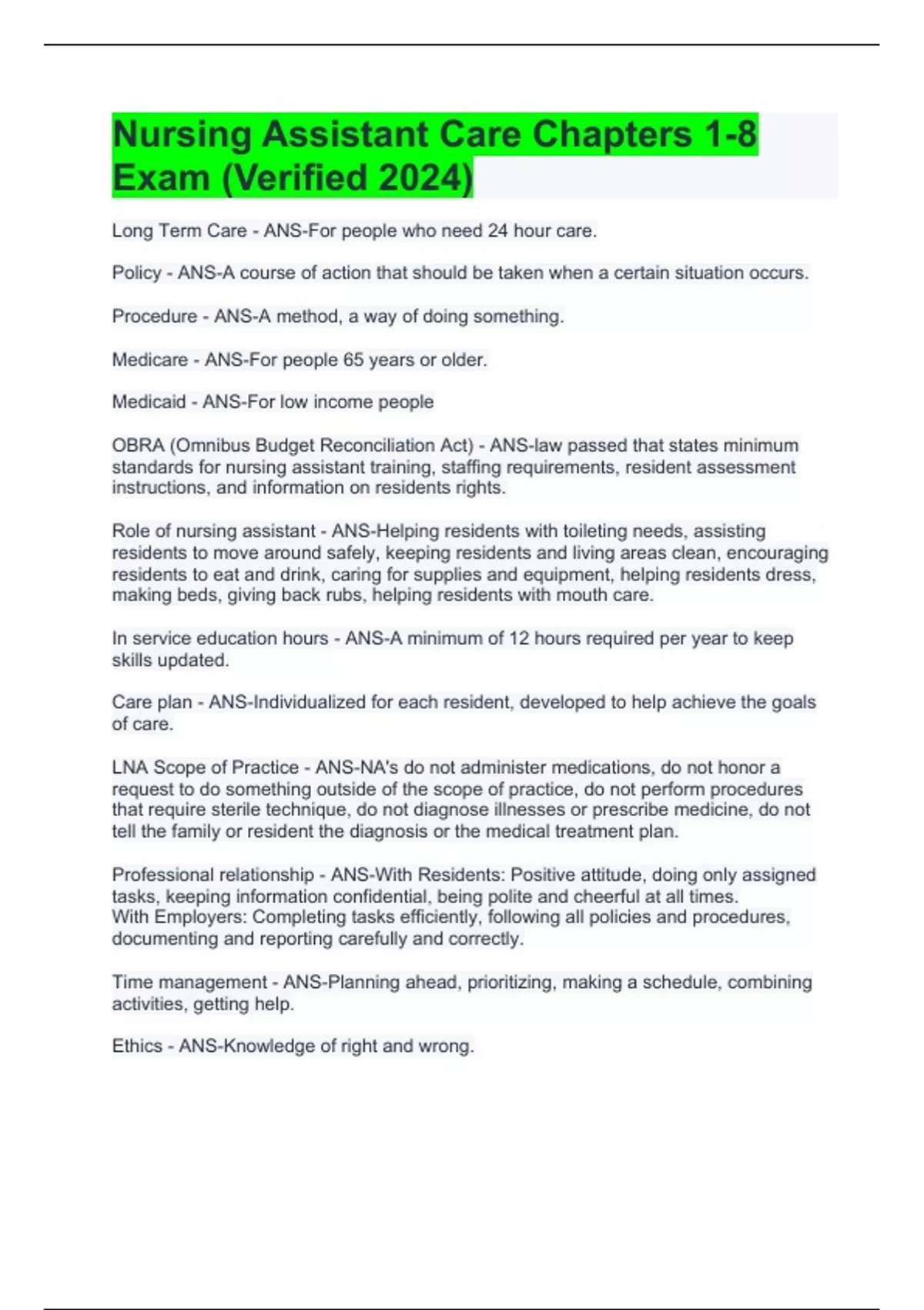 Nursing Assistant Care Chapters 1-8 Exam (Verified 2024
