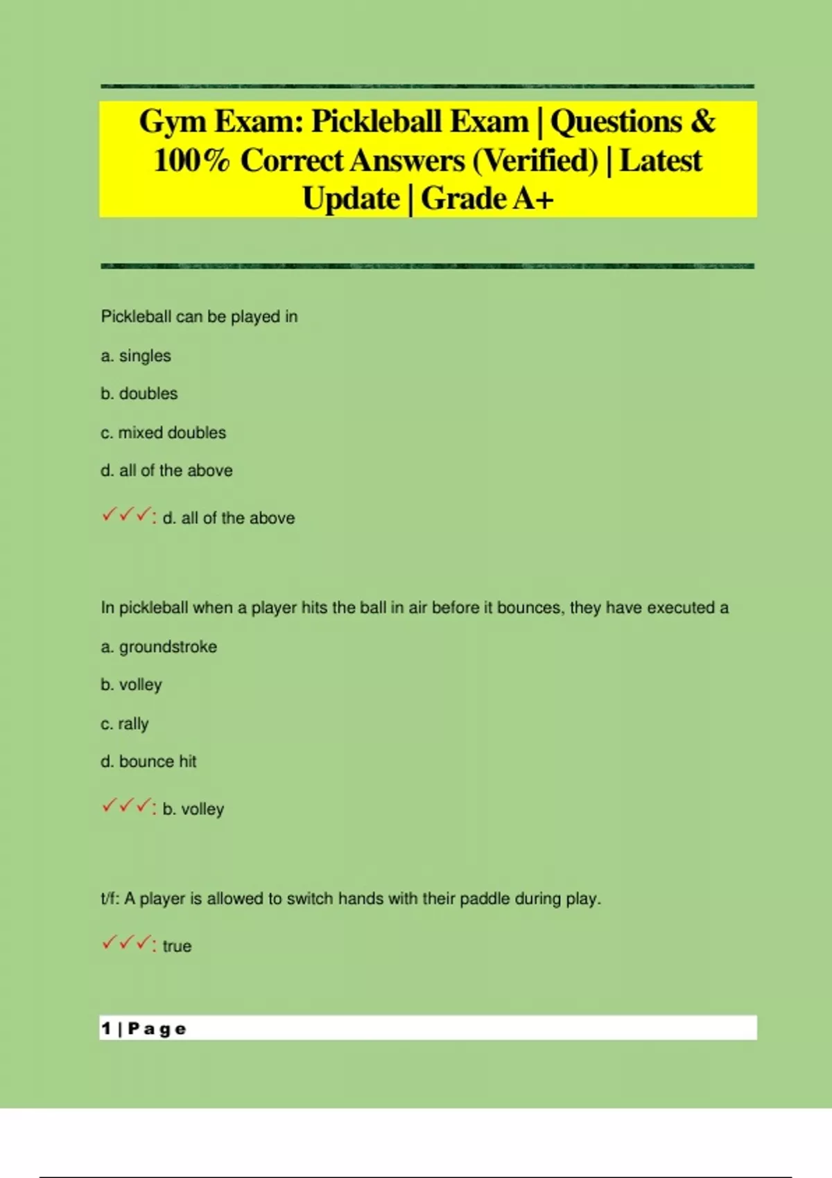 PickleBall Exams pack | Questions & 100% Correct Answers (Verified) | Latest Update | Grade A+