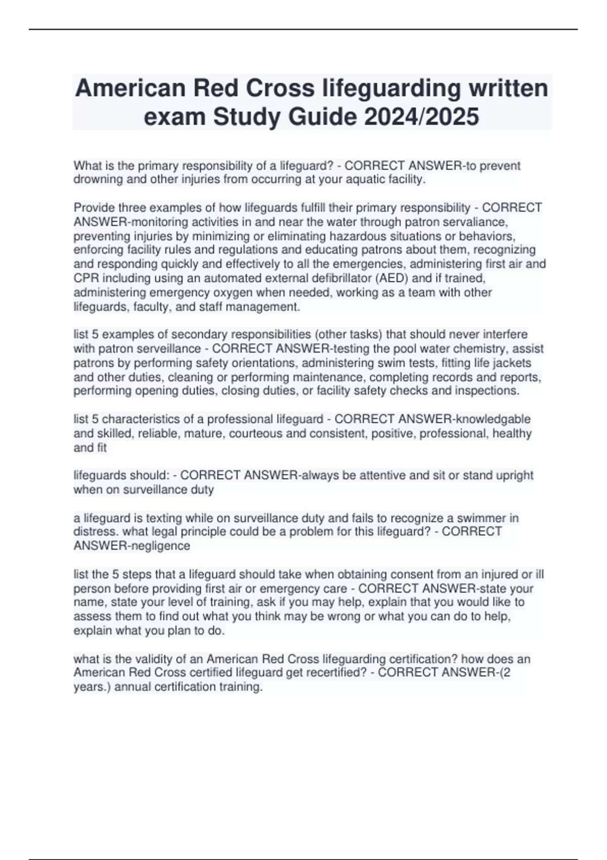 Package deal for American Red Cross lifeguarding written exam Study Guide 2024/2025