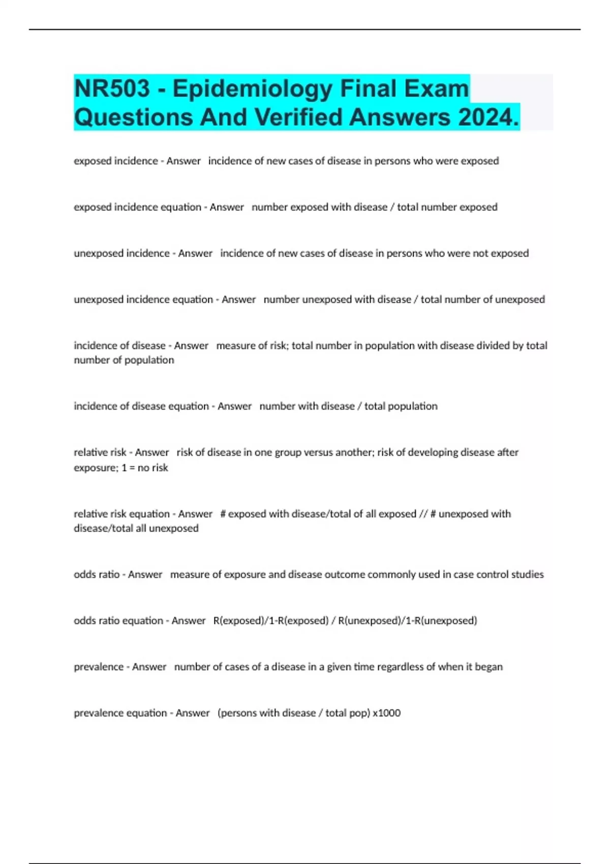 1 Exam (elaborations) NR-503 Epidemiology Final Exam Questions Fully Solved 2024. 2 Exam (elaborations) NR 503 Chamberlain Mid Term Exam Questions With Correct Solutions 2024. 3 Exam (elaborations) NR 503 Epi Pro Final Exam And Verified Answers 2024. 4 Exam (elaborations) NR 503 Epi Midterm Exam Questions And Correct Answers 100% 2024. 5 Exam (