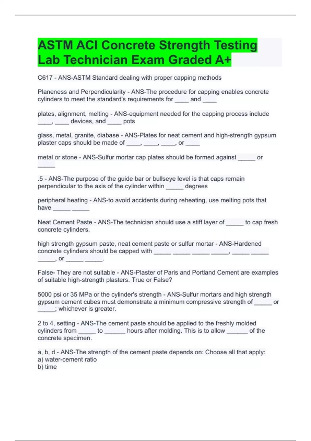 1 Exam (elaborations) ASTM ACI Concrete Strength Testing Lab Technician Exam Graded A+ 2 Exam (elaborations) ACI written exam questions and answers 3 Exam (elaborations) ACI Test Questions and Answers 100% 4 Exam (elaborations) ACI Strength Exam Study Guide with Complete Solutions 5 Exam (elaborations) ACI Grade 1 - Written Test Graded A+ 6 Ex
