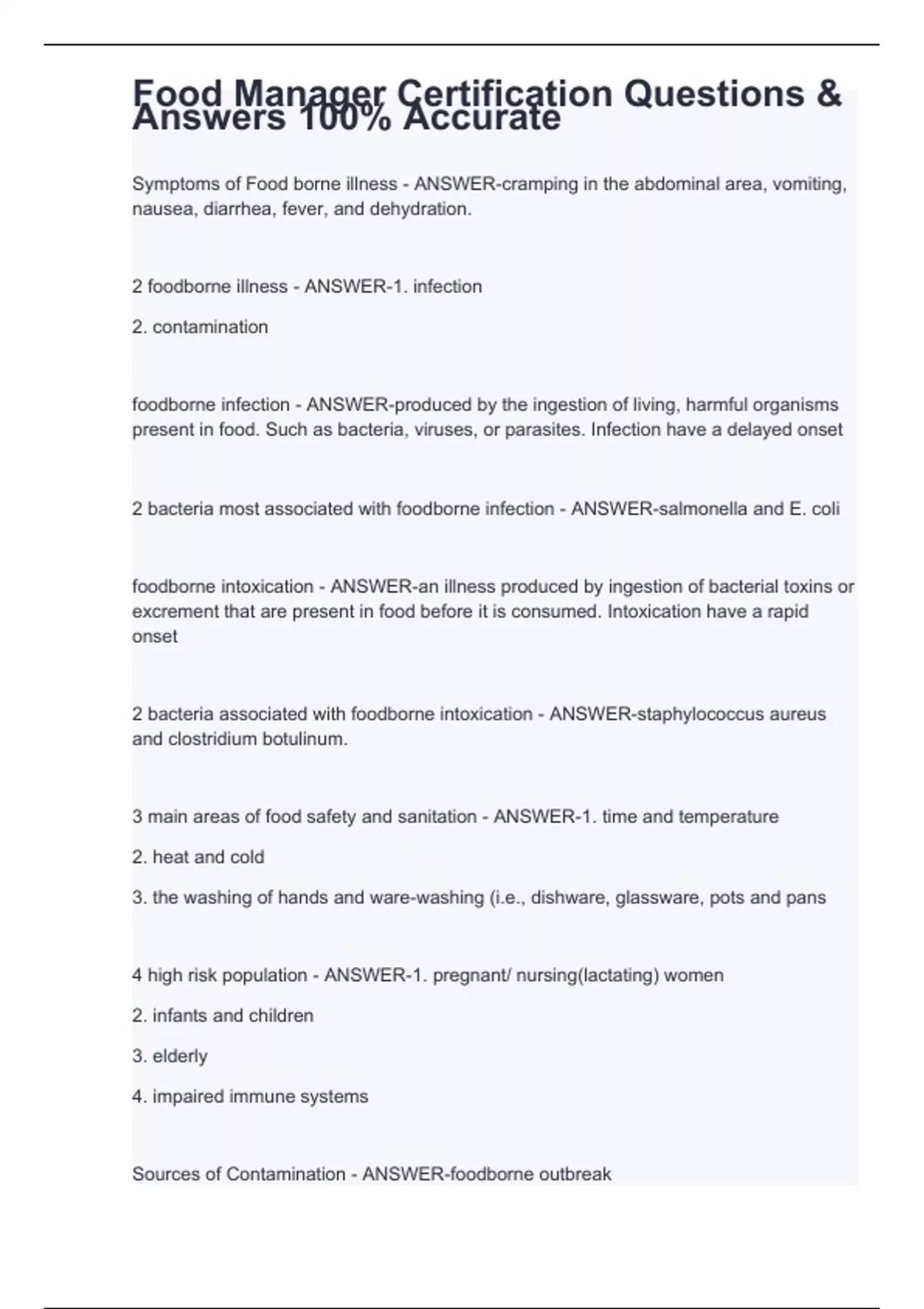Food Safety Manager Certification Exam Questions With Complete Solutions