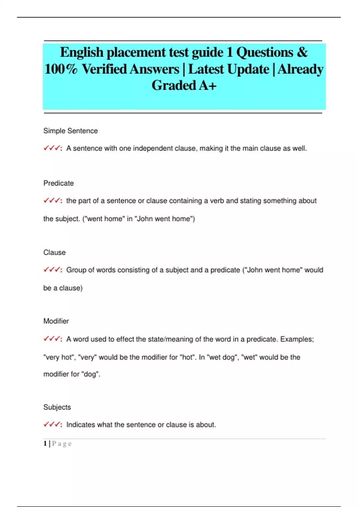 English Placement Test Questions & 100% Verified Answers Package | Latest Update