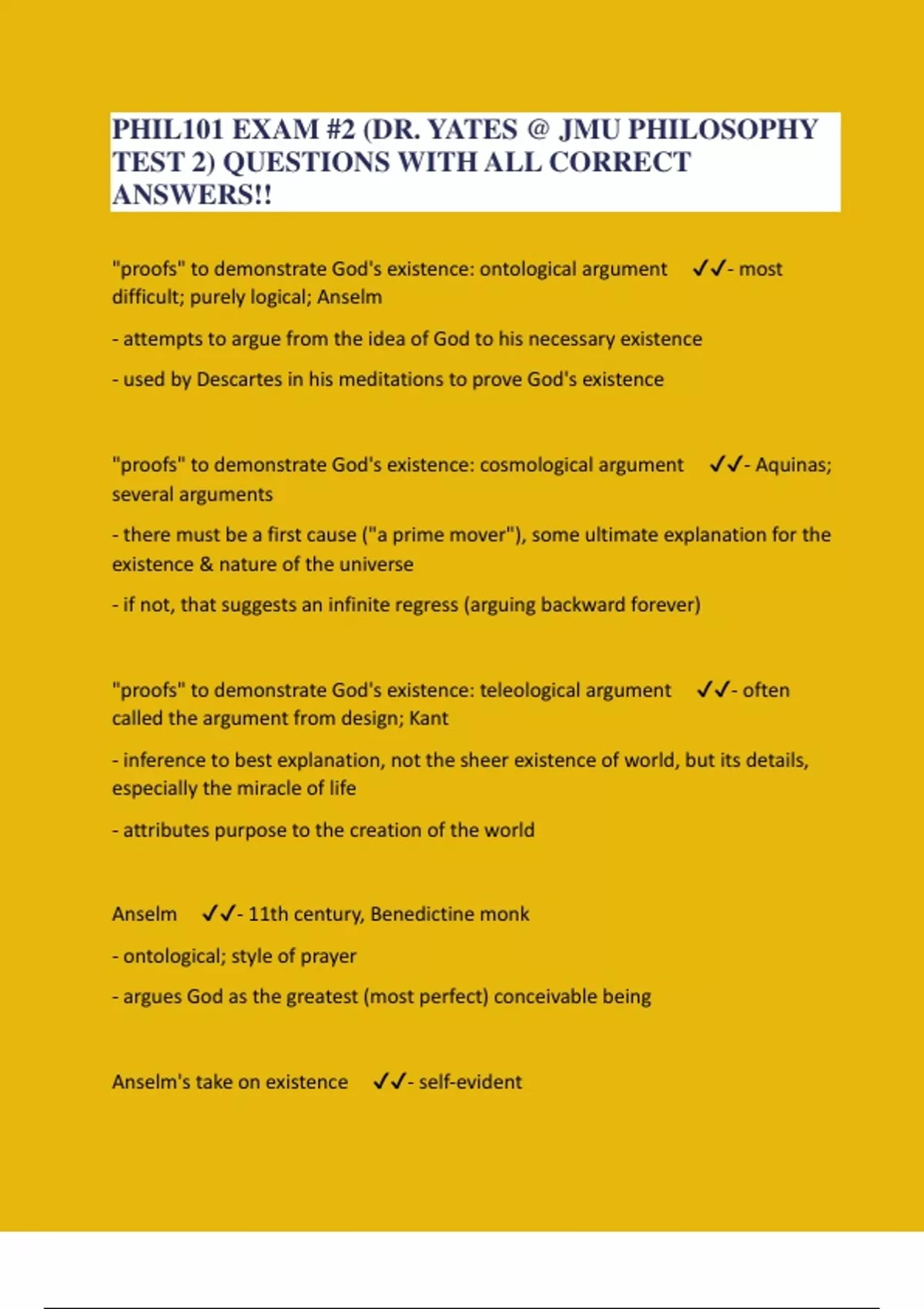 PHIL 101 EXAM 3 JMU YATES QUESTIONS & ANSWERS SOLVED 100% CORRECT!! PHIL101 EXAM #2 (DR. YATES @ JMU PHILOSOPHY TEST 2) QUESTIONS WITH ALL CORRECT ANSWERS!!