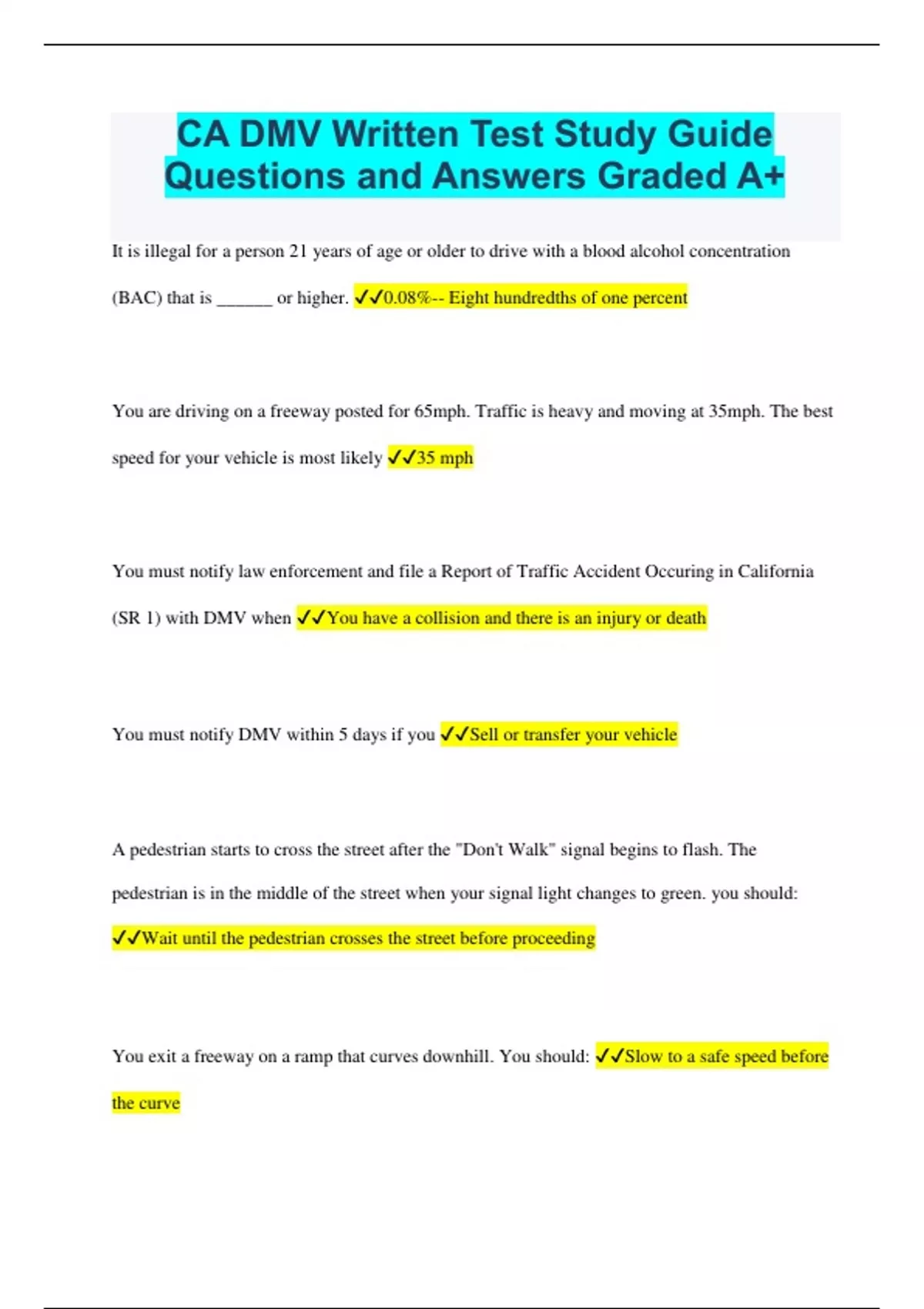 CA DMV Written Test Study Guide Questions and Answers Graded A+
